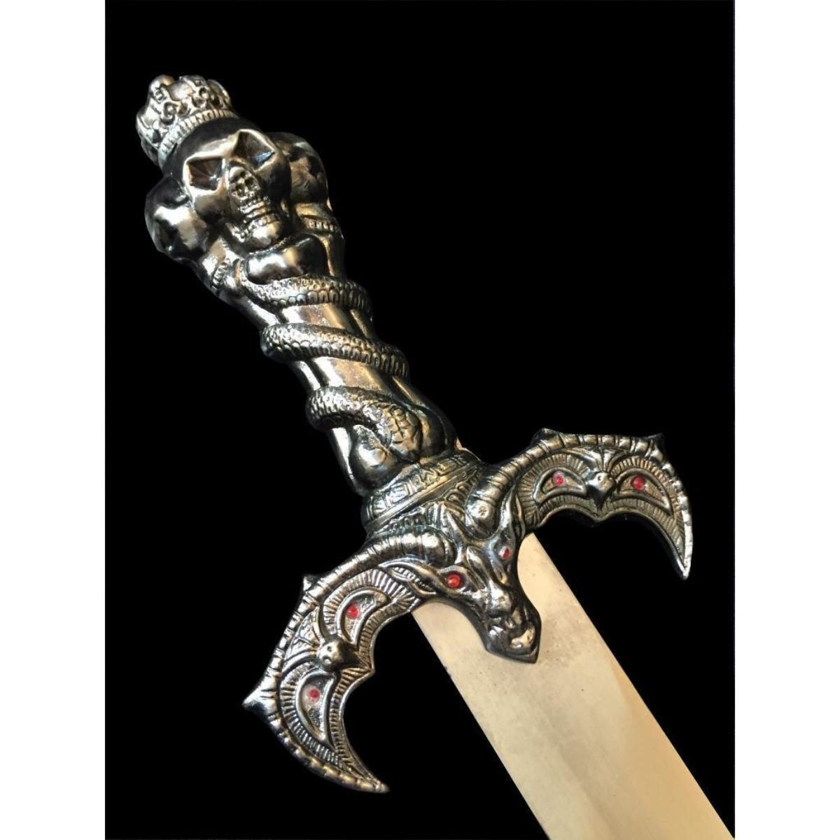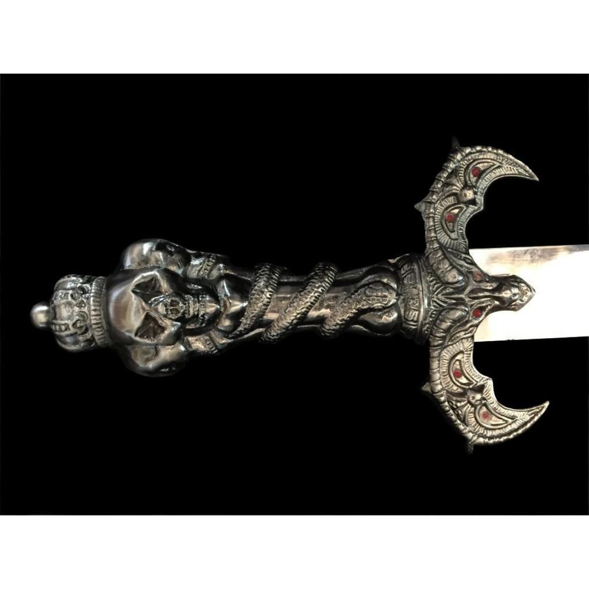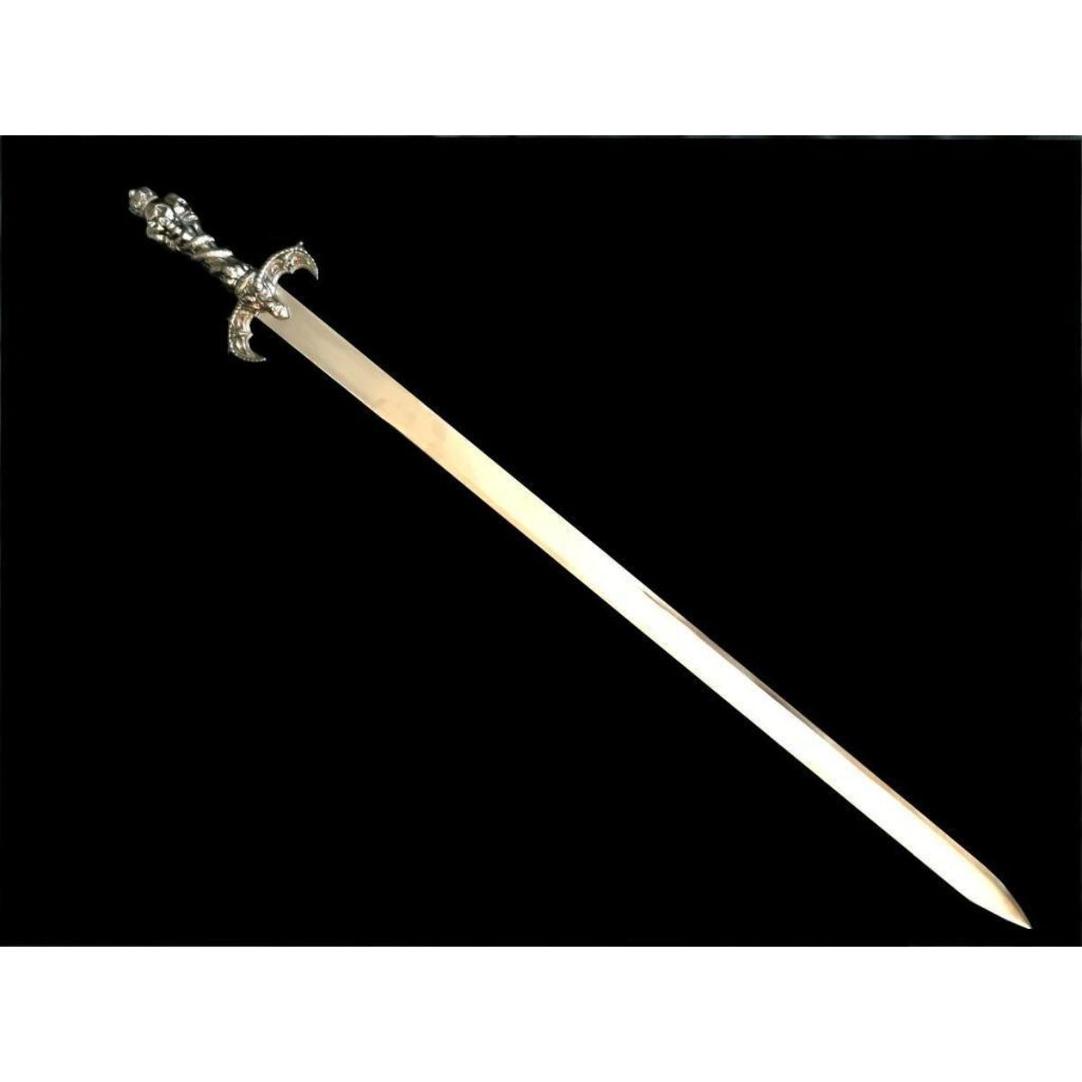 High polish, mirror finish, 440 stainless steel. Demons of the underworld ritual piece. European-style, one handed long sword with angled factory edge, unsharpened, display quality blade. Full tang of 5" with welded