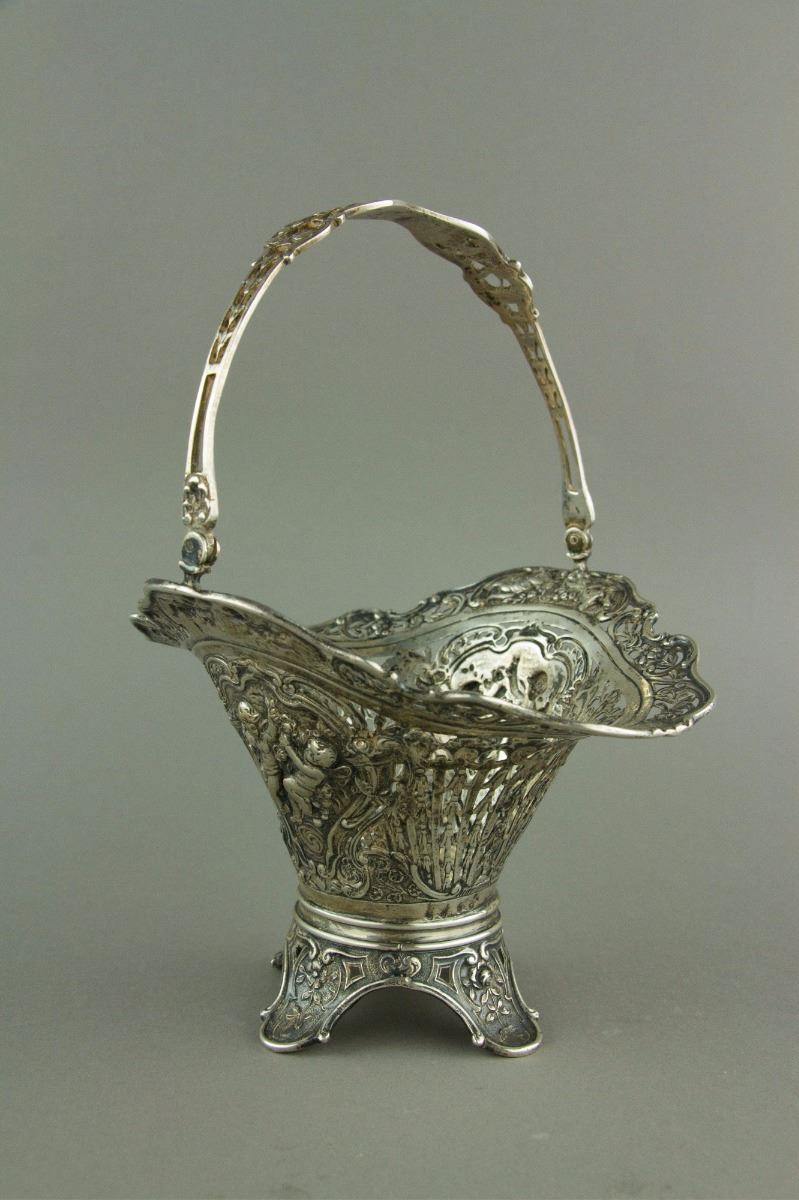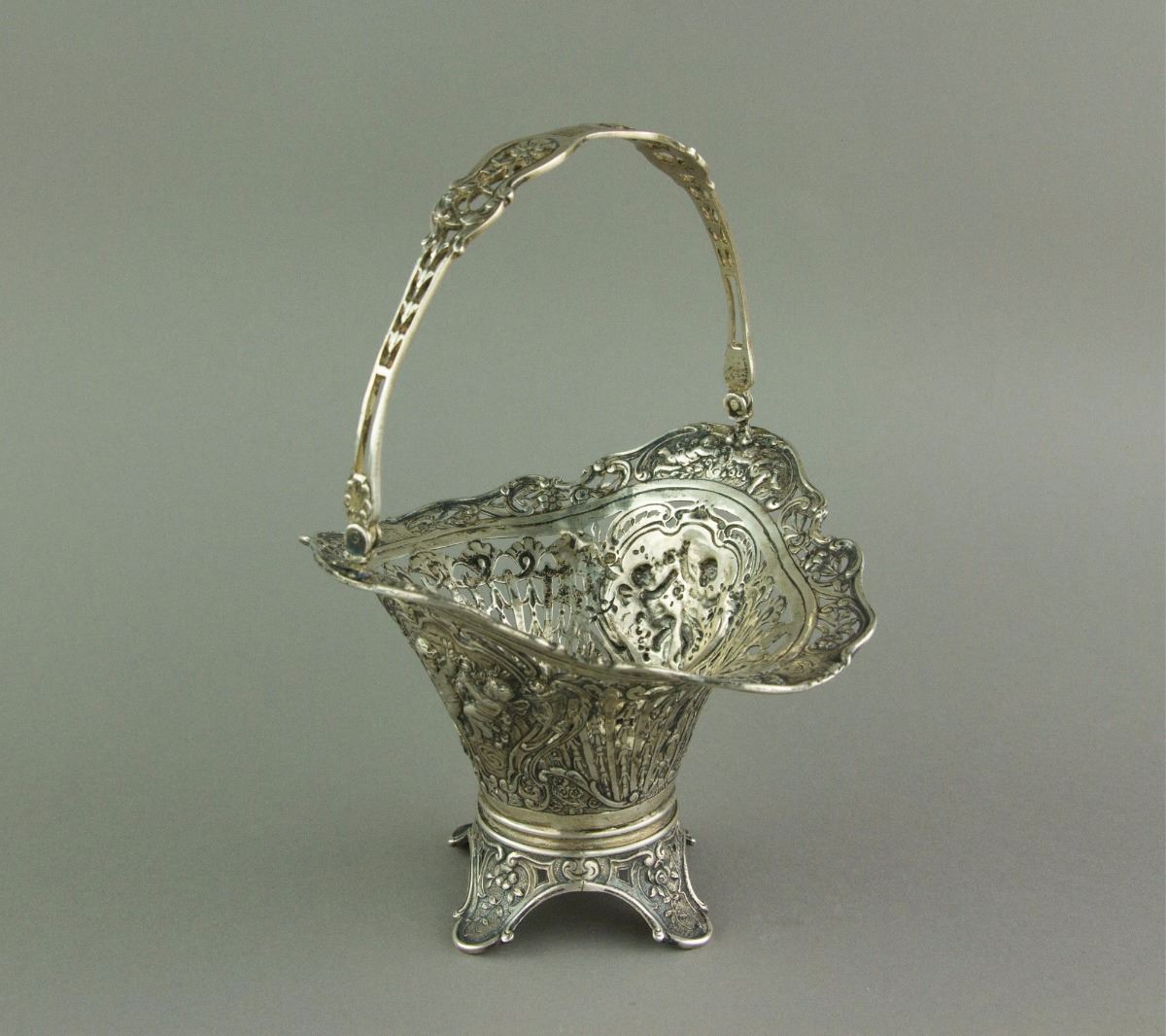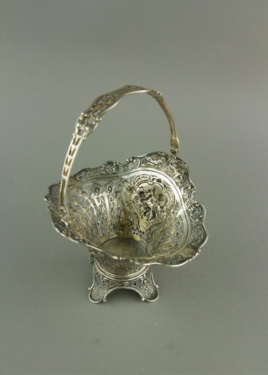 European style silver cake basket with a swing handle; supported on foliated foot; H: 19 cm, L: 14 cm, 206 grams