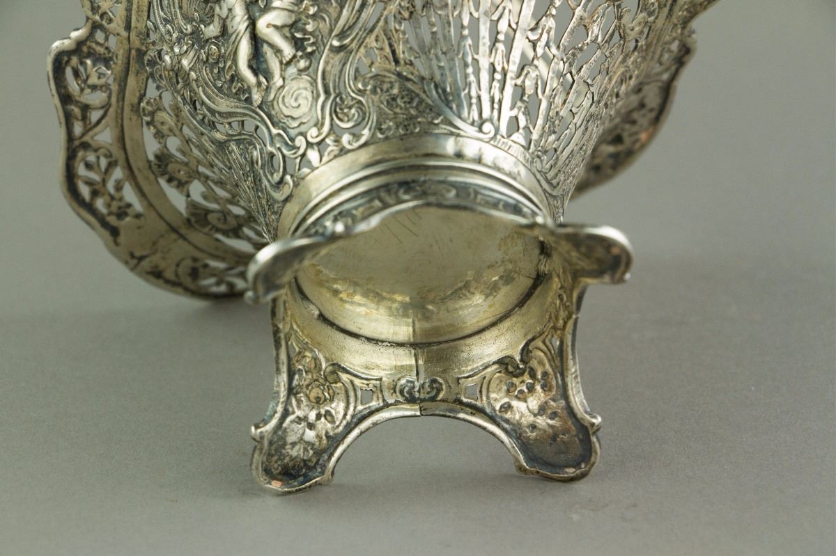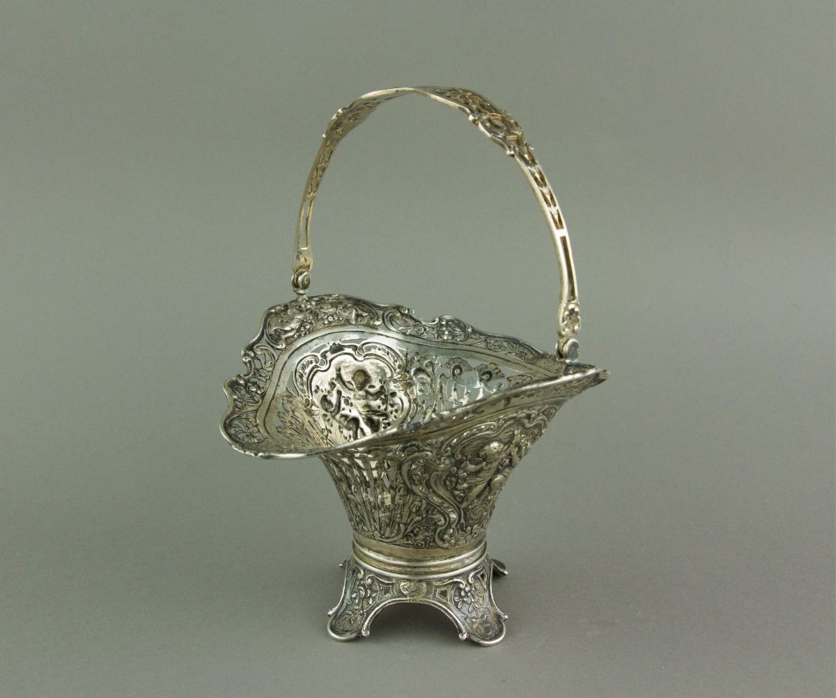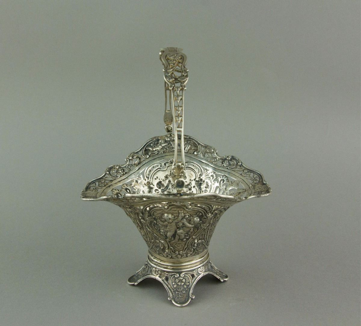 European style silver cake basket with a swing handle; supported on foliated foot; H: 19 cm, L: 14 cm, 206 grams