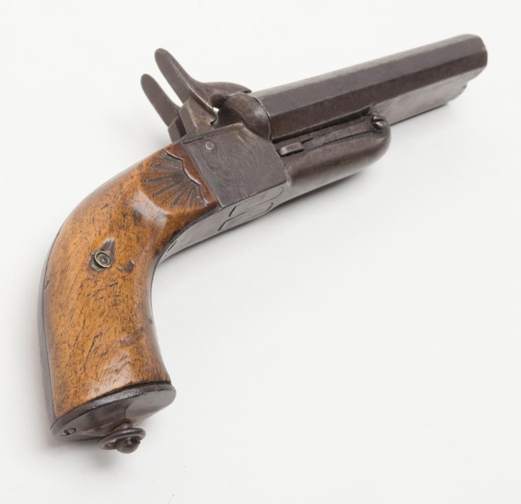 European SxS folding trigger pinfire pistol, .54 cal., 5” octagon barrel, engraved frame, scalloped grip with lanyard ring in overall uncleaned good condition showing a heavy dark patina, good action, dark bores, good grips. (Antique).Est.: $200-$400.