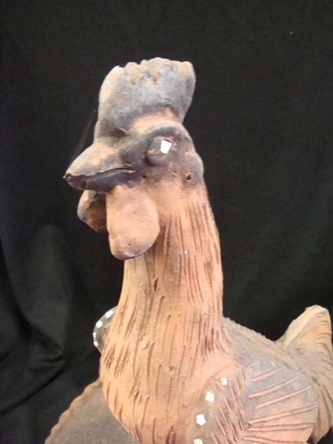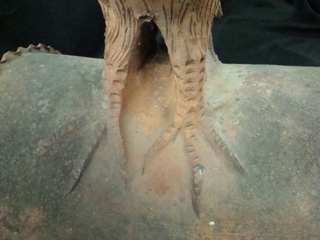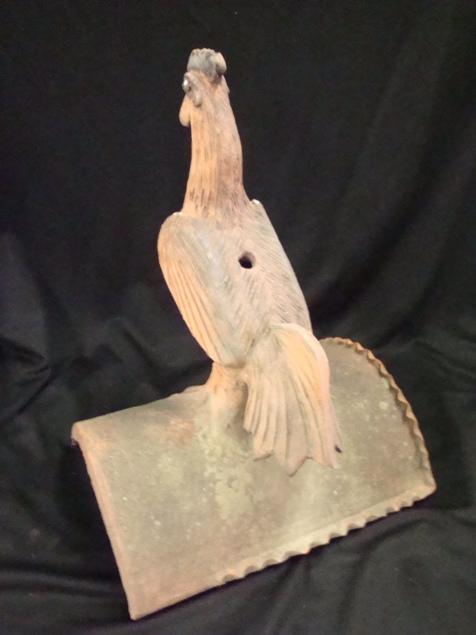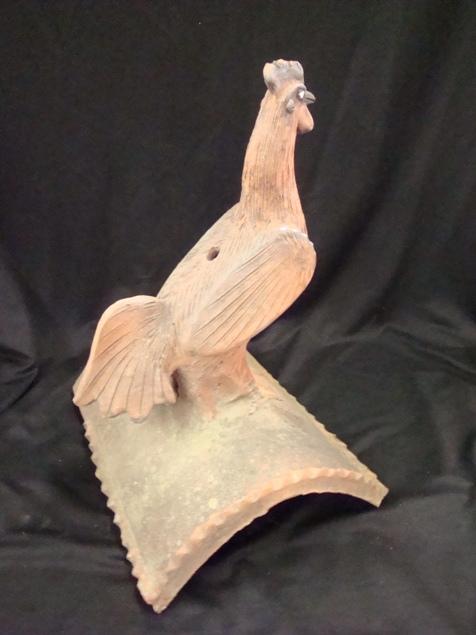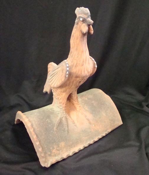 Excellent terra cotta rooftop tile, perhaps used on the peak of a home to hold a lighting rod in place. This outstanding piece stands a proud 18" tall, the base is 15" long. Great decorative or garden piece!
