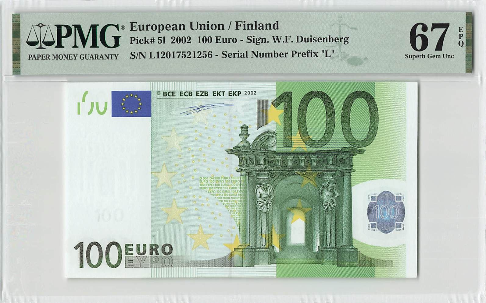 European Union 100 Euro 2002 Finland D001D4 Duisenberg Pick 5l PMG Superb Gem UNC 67 EPQ