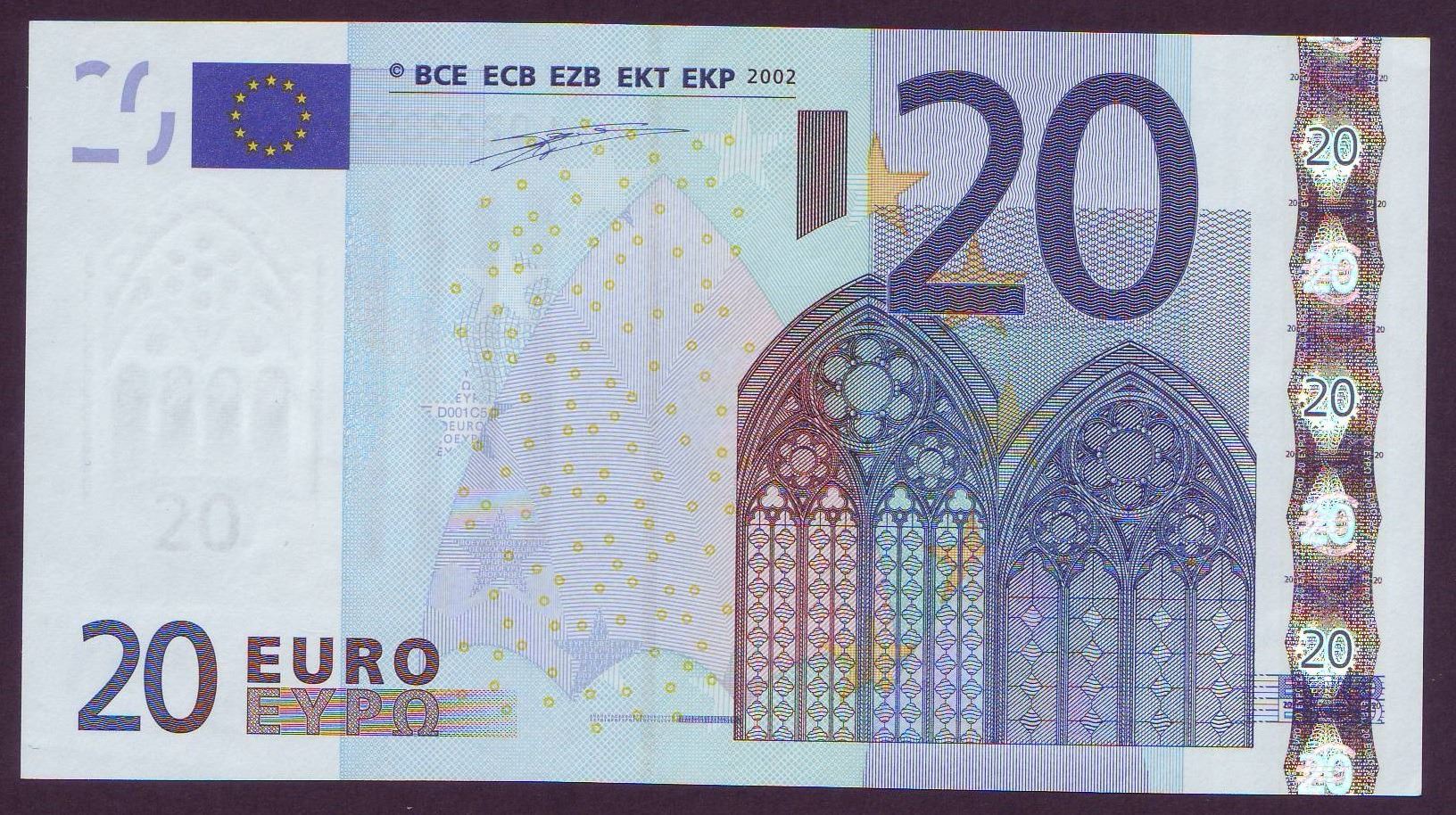European Union 20 Euro 2002 AU/UNC Missing Irodine Strip Error / Missing Glossy stripe Error Finland D001C5 Duisenberg Pick 3l