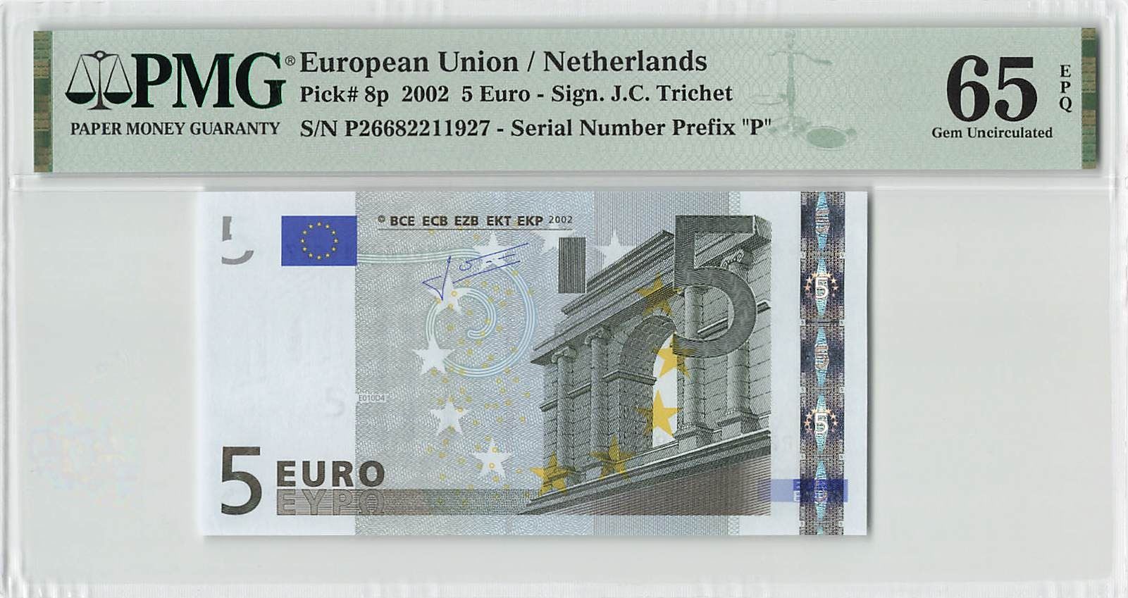 European Union 5 Euro 2002 Netherlands E010D4 Trichet Pick 8p PMG Gem UNC 65 EPQ