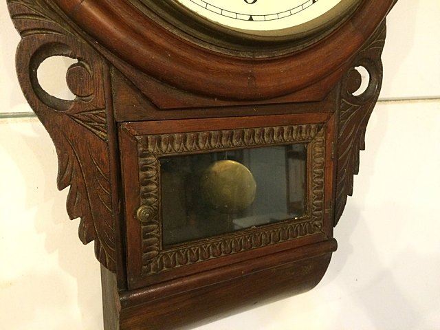European Wall Regulator Clock with fancy carved case, original pendulum, nice style, probably mahogany case, carved leaves flank door, carved lower door.