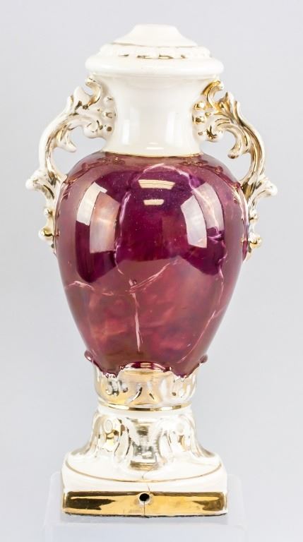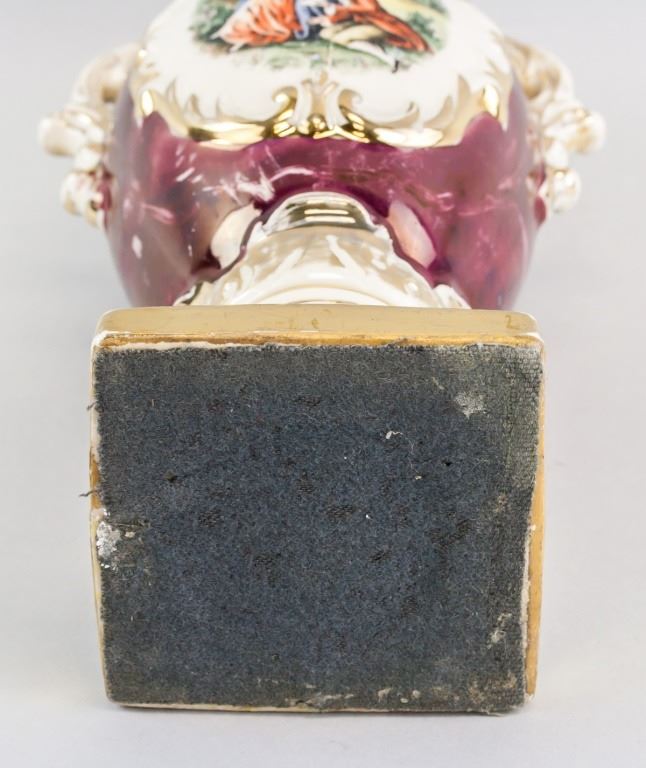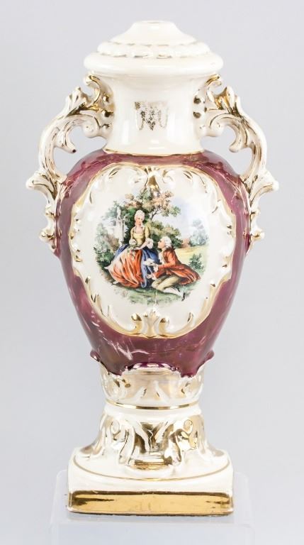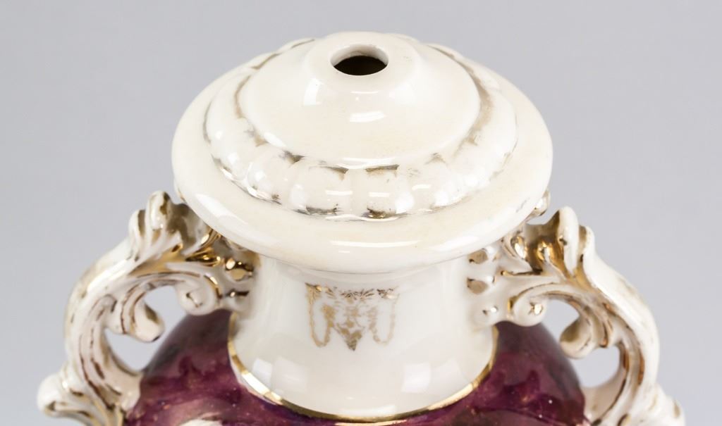European porcelain vase. Of white and purple tone, with ornate handles. Painted with garden scene of a man and woman. Damage near base. 30 x 15 cm. 1,138 grams.