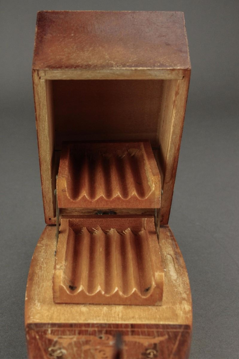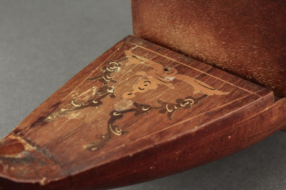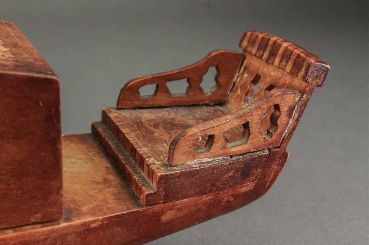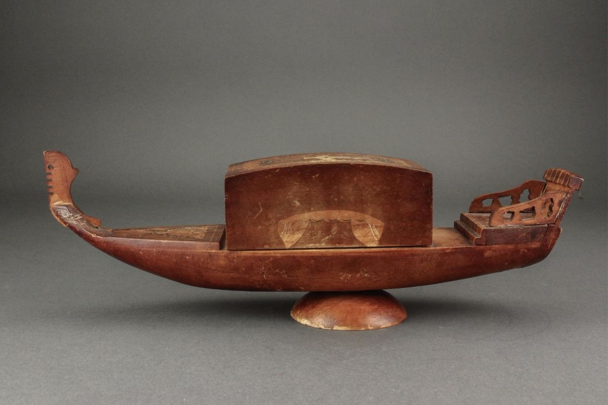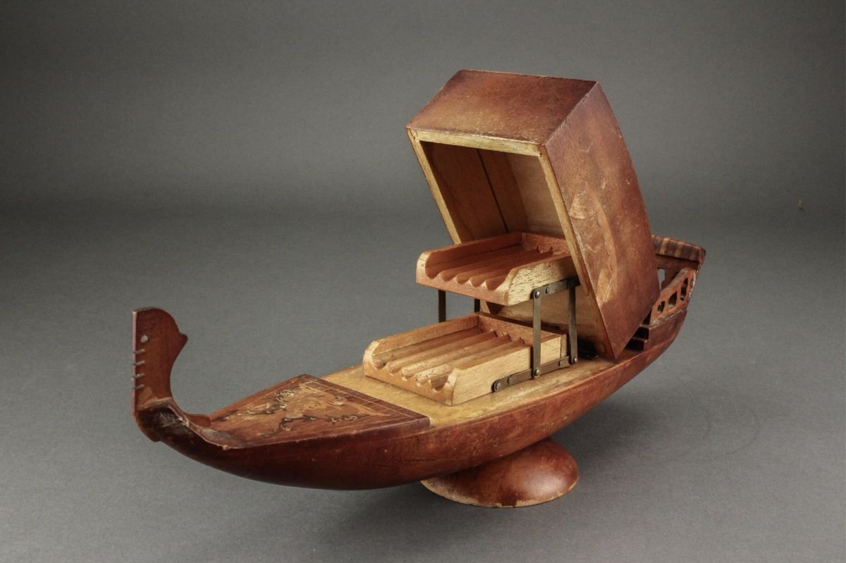 European Wooden Musical Cigarette Holder; in form of boat; decorated with European scrolling floral design; L: 33 cm, H: 10 cm, 425 grams