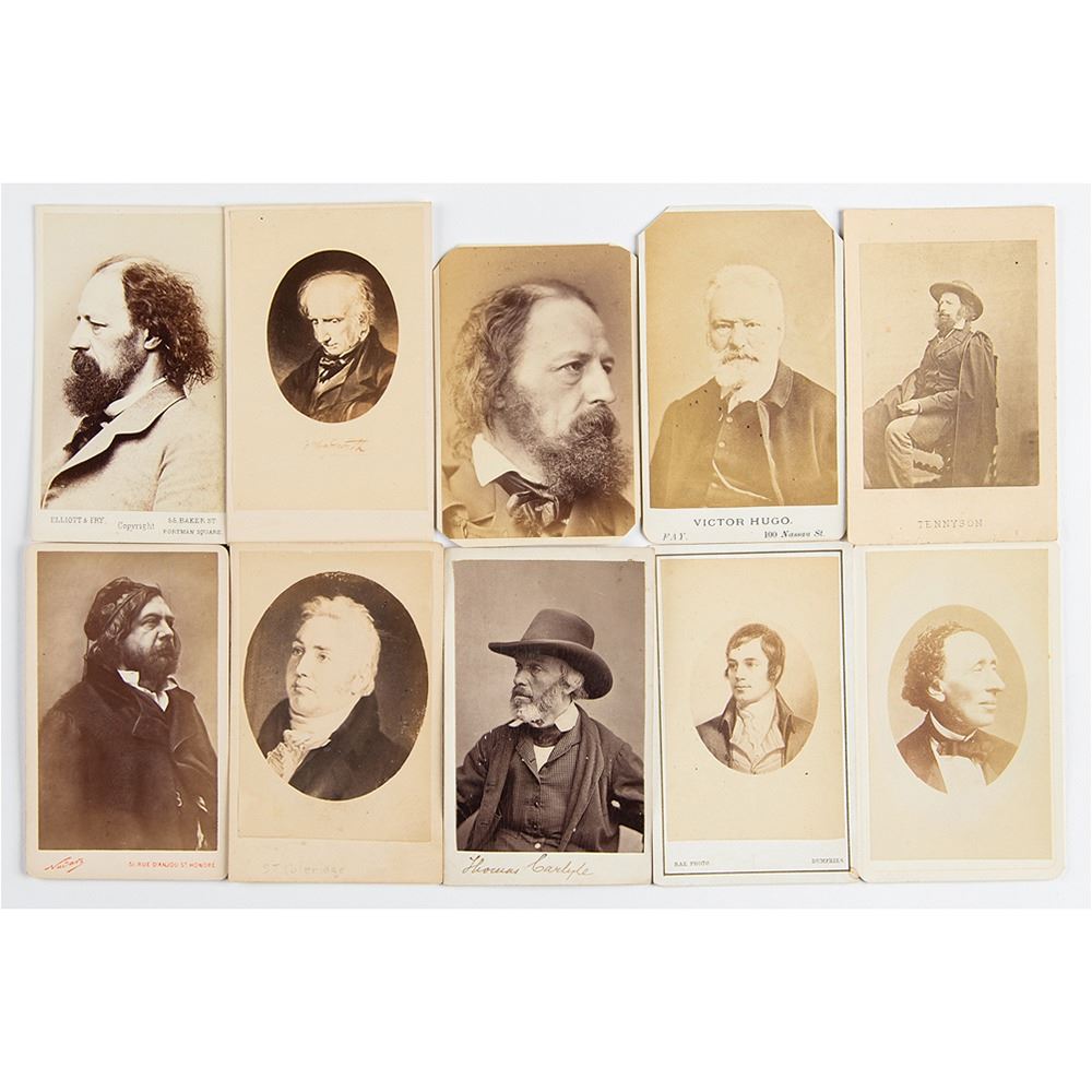 Group of 10 carte-de-visite portraits of noted European authors, including a combination of real photographs and images of artworks portraying the writers. Subjects include: Victor Hugo, Alfred Lord Tennyson (3), Hans Christian Andersen, Robert Burns, Thomas Carlyle, Samuel Taylor Coleridge, Theophile Gautier, and William Wordsworth. In overall fine condition, with clipped corners to Hugo and one of the Tennysons, and various pencil notations on the reverse.