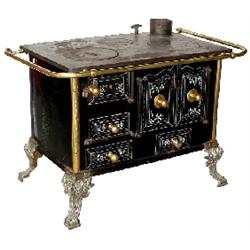 European cast iron & enamel stove, 3 burners w/6 enameled doors w/brass knobs & rail, desirable small size, VG condition, 26"W x 19"H.
