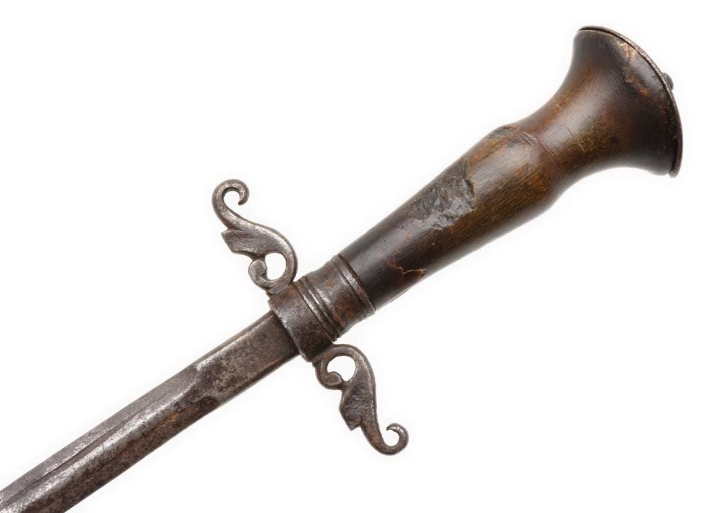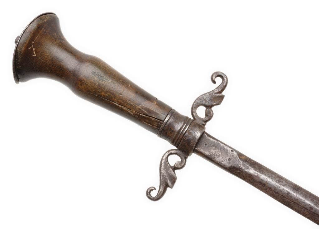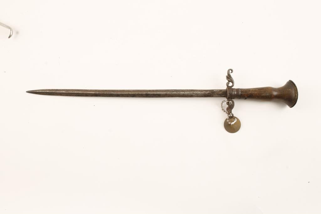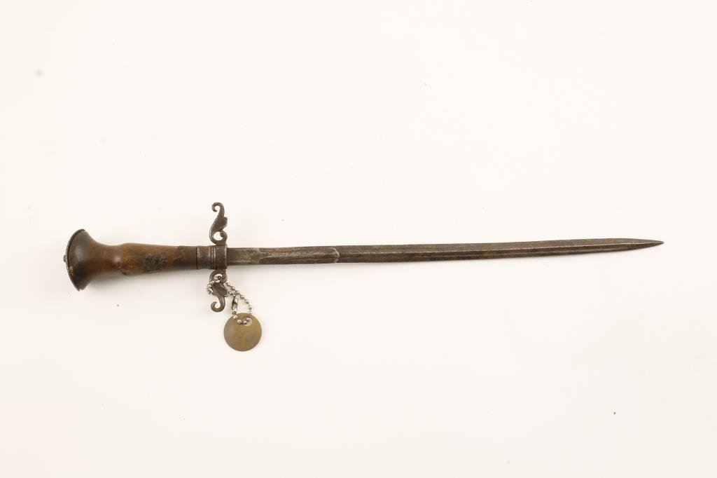 European dagger with wood handle & “toothpick”-type blade, approximately 16” overall with a 12” iron blade; wood grip displaying some scattered damage; simple iron pommel cap. This piece is in overall good condition showing a dark patina and attached collection or museum brass tag “S 37”. Est.: $200-$400.