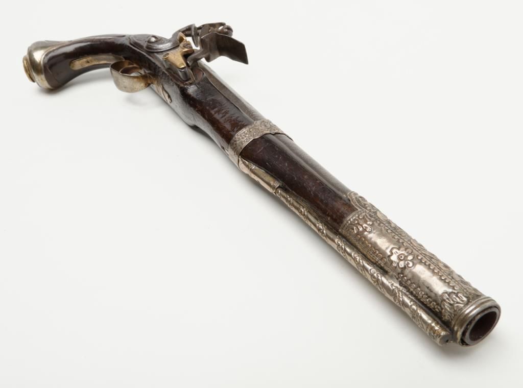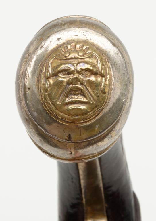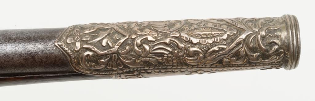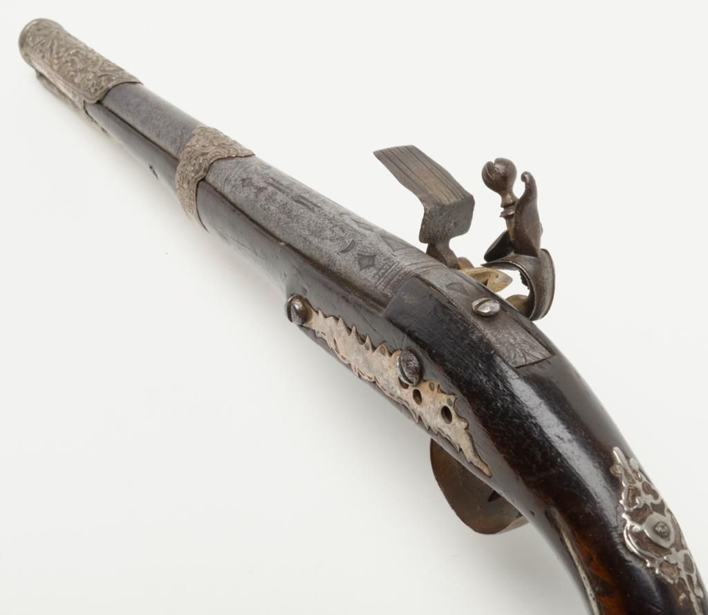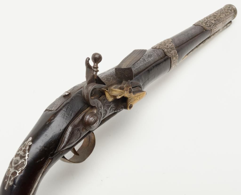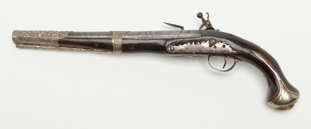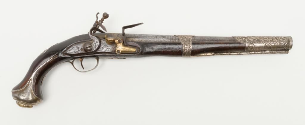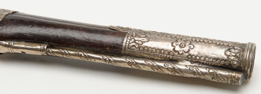European flintlock pistol remounted and stocked for mid-eastern trade showing fancy silver mounts circa early 19th century. The pistol measures 19” overall with 12 ¼” barrel of approximately 60 caliber smoothbore. The barrel and lock plate show a gray patina with some scattered erosion and pinprick pitting. The stock is somewhat crudely made and the mounts not quite of European quality. There is a small touch mark on the ramrod thimble. The silver mounts have dulled and showsome gold wash on the butt cap and would polish nicely. The condition is fair to good overall. Est.: $600-$1200