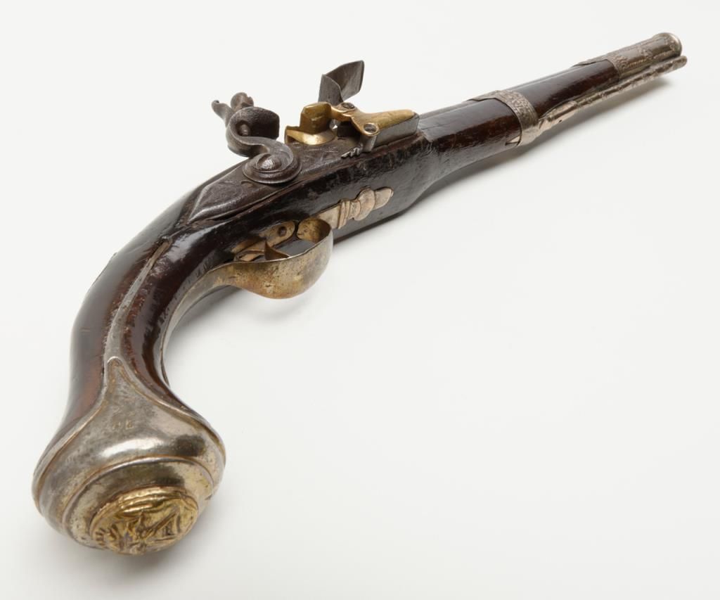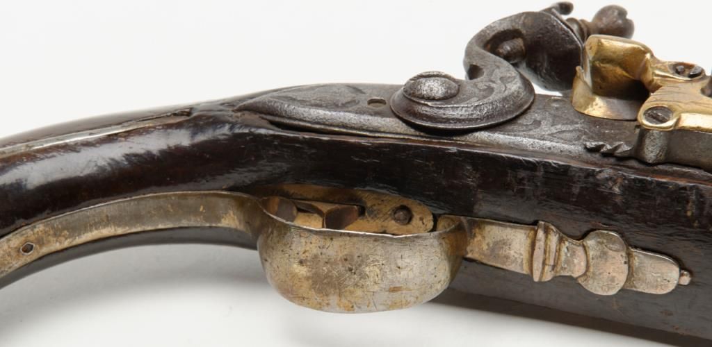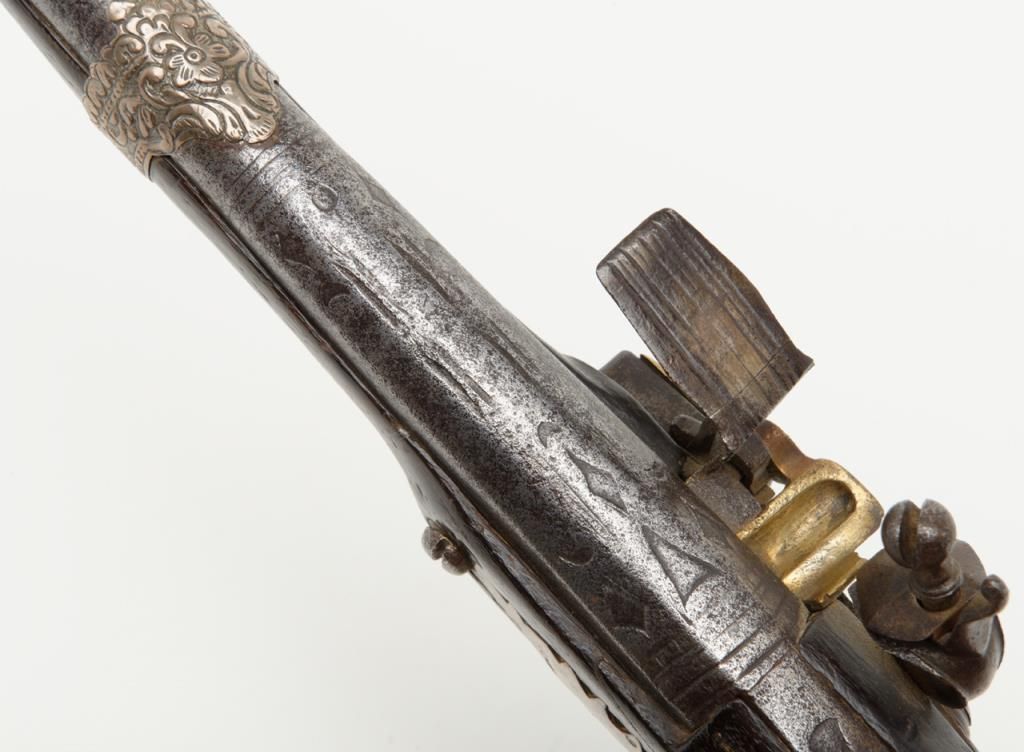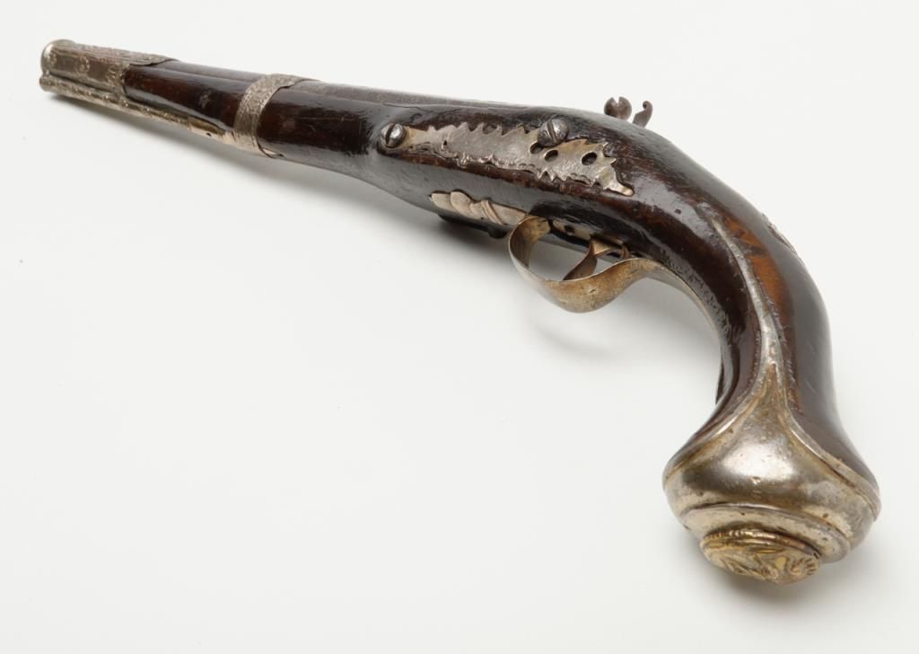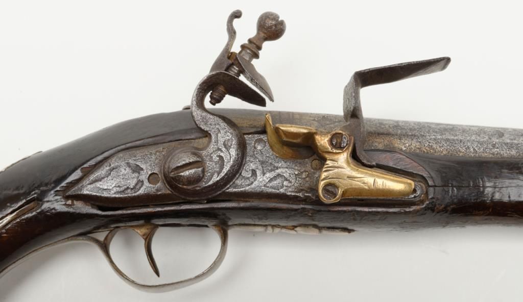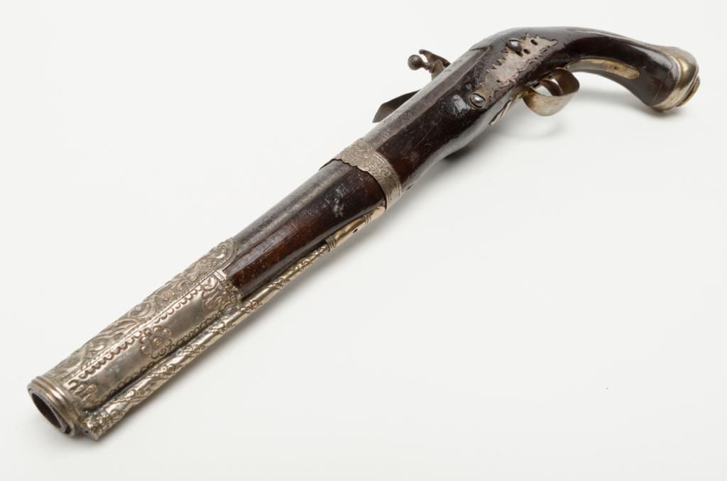 European flintlock pistol remounted and stocked for mid-eastern trade showing fancy silver mounts circa early 19th century. The pistol measures 19” overall with 12 ¼” barrel of approximately 60 caliber smoothbore. The barrel and lock plate show a gray patina with some scattered erosion and pinprick pitting. The stock is somewhat crudely made and the mounts not quite of European quality. There is a small touch mark on the ramrod thimble. The silver mounts have dulled and showsome gold wash on the butt cap and would polish nicely. The condition is fair to good overall. Est.: $600-$1200