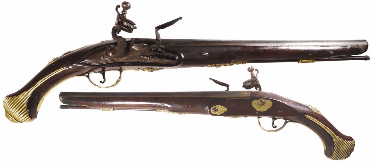 European flintlock pistol signed by owner or maker "E. Covna," 1700s. 1123 grams, 20" long. Engraved decorations, deep touch marks, walnut stock with ornate brass mounts, original ramrod with screw tip, and engraved lock signed "E. Covna." Very good original condition with functioning lock. Small chip or loss to stock nose. With photo-certificate.