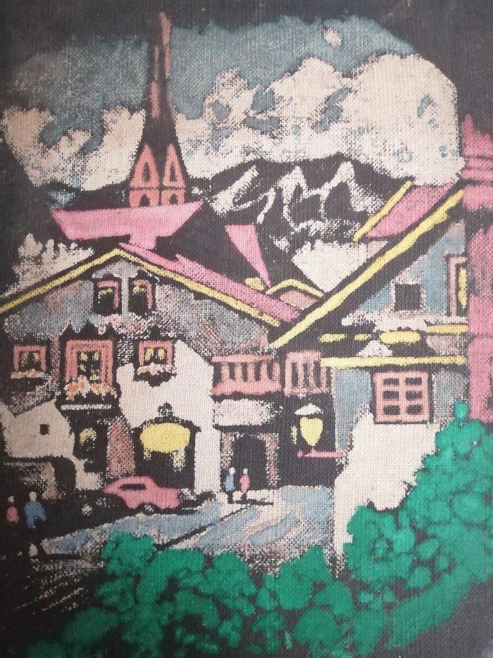 Painted house scene with a church and mountains in the background. Dated from the 1980's. Size: 18x14 inches.