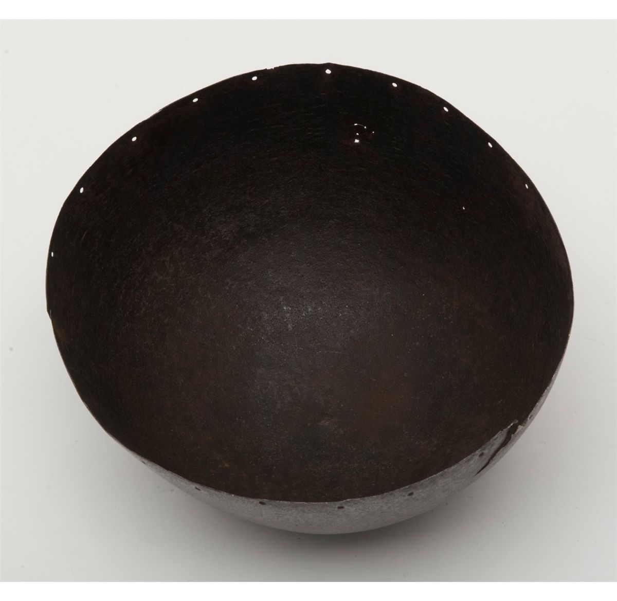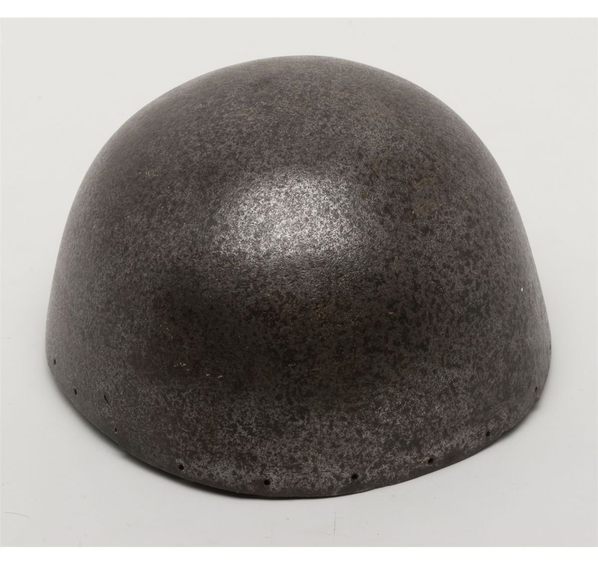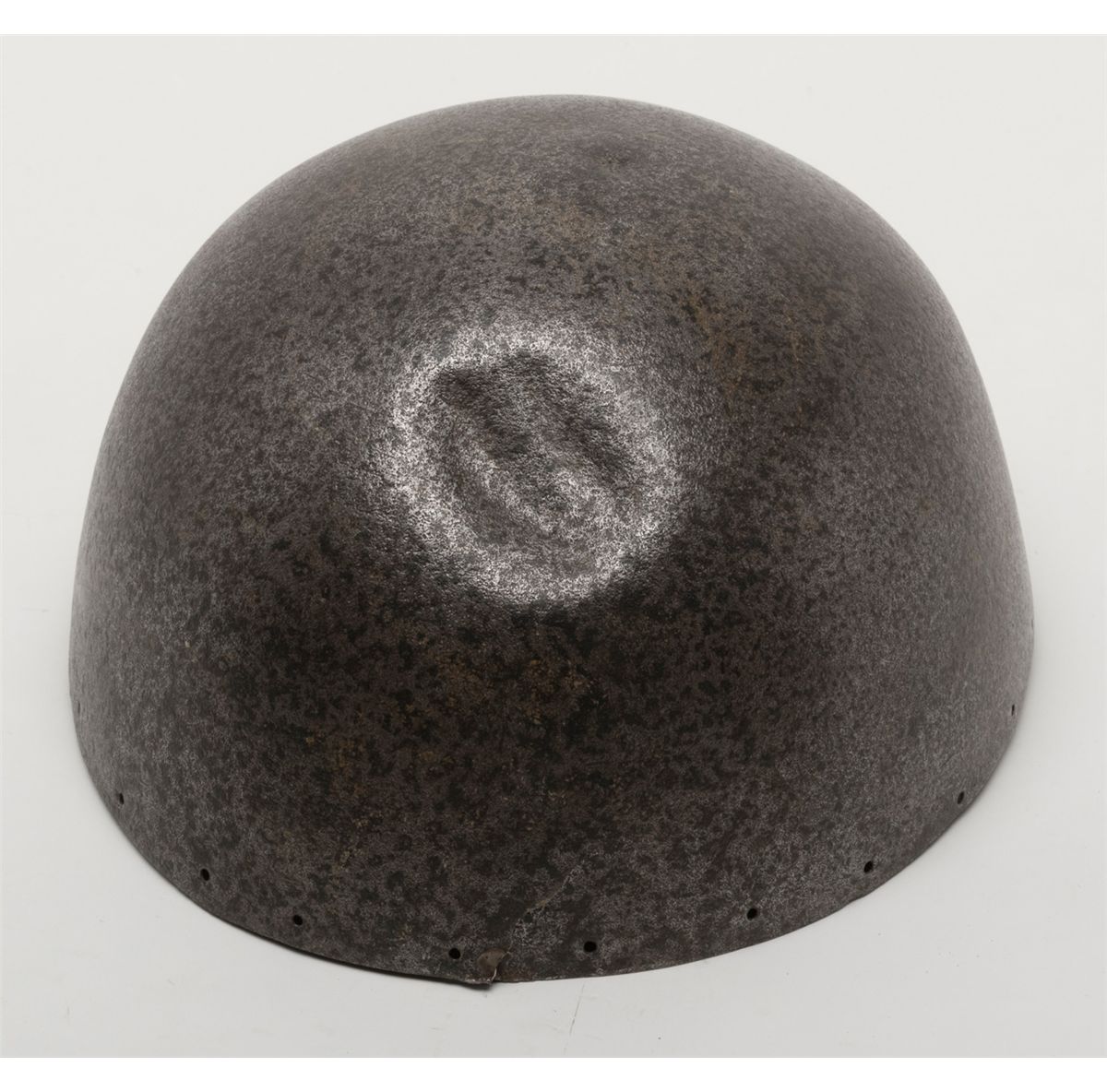 European made gothic era archer’s helmet circa about 1450 showing early lamination and proper forging. The top of the helmet shows a large dent and there is some slight wear through and normal aging. A museum quality display stand with labelis included. This helmet could logically be the beginning element in an early arms collection. Est.: $1500-$3000