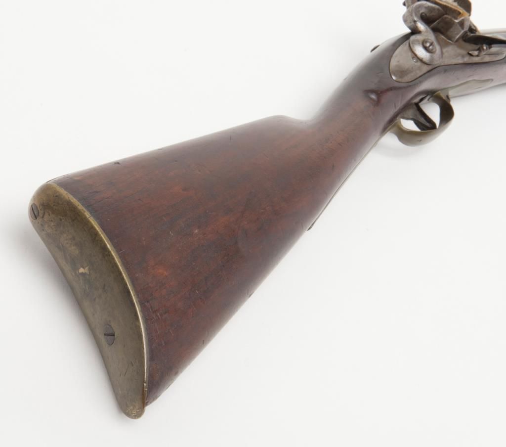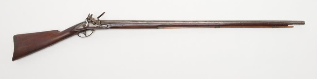 European made military style flintlock musket showing probable American restock in a reddish colored wood with no bands. The musket shows an unidentified proof just in front of the frizzen area along with the initial “B” and numerals“411”. The musket measures 58 ½” overall with almost 43” barrel of 75+ caliber. Brass mounts with no side plate and locks is secured by a single screw. The left side of the stock beneath the screw is stamped in neat block letters with aprofessional stamping “F.F. Webster” and there is a carved set of initials or design cut above the stamp. The metal surfaces show a gray patina finish with some light to moderate erosion and pinprick pitting. The top jaw and screw are oldreplacements and handmade. The wood is very good plus other than a large piece nailed in front top edge in front of lock which is an old repair. There is a stamped proof or inspectors mark in front of the trigger guard and behind the tangwhich we cannot identify. The lock shows a banana shape and is pre-1750 in our opinion. A very interesting and early European arm that may have been American restocked and issued to militia. Est.: $1400-$2800