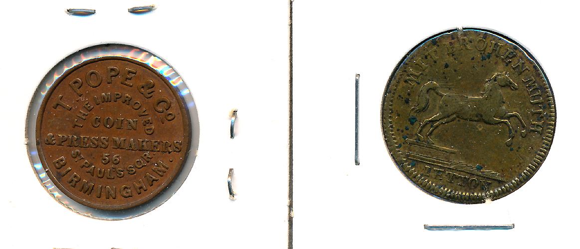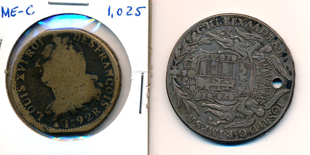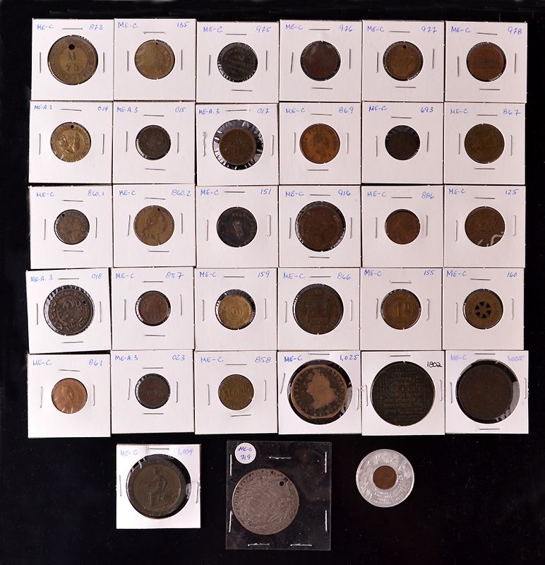 Great Britain, Penny, 1797; Cheapside Half Penny, 1814; Gregory Browne, Royal Artillery Canteen, Woolwich, Penny; Misc. 19th Century tokens, (8), 1832 to 1888; Counters and souvenirs, (5); Calendar token, 1802; Apothecary weights, (2); European Jeton, Maria Theresa, Foecunda Coronis, 1667; Hungary, Thaler, 1783B, KM#395.1, holed; Coins, (3); misc. tokens, (8); Encased Italian Centisimo, 1918, D.A. Pola; total of 33 pcs.