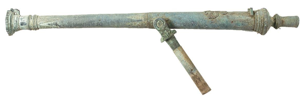 Bronze or cast construction, 48 1/2" long, with a flared muzzle, raised butterfly decoration on top of the rear end of the barrel, with cast in triangular ornamentation around the breech and muzzle of the cannon, 35mm bore, sighting posts, 1 1/4" trunnions and a hollow knob for a guide rod. With a matching pintle, set into a later production concrete filled steel pipe. In good condition, with a gray aged patina overall, looks to be circa 19th century.