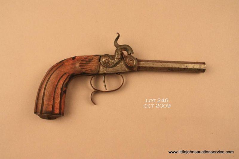 European percussion single shot pistol, .41 cal., 4” octagon barrel, 10” overall. This gun is in overall good condition with scattered light to moderate pin prick pitting and erosion on the barrel, nicely engraved hammer and frame,scalloped and grooved wood grip, good action, trigger guard slightly loose. Est.: $150-$250.