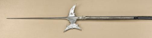 European pole-arm circa 1500 – 1650, showing nearly 25” spike. The front of the blade shows a crack and loss of metal from use, possibly battle. The shaft has been reduced and there is an old metal collection tagattached, which is stamped “Adhemar Von Linden, #8. 1882.” The polearm now measures 86-1/4”, probably originally 12” longer, the wooden shaft approx. 55” . The leather wrap is replaced. Est: $1,250 - $2,500