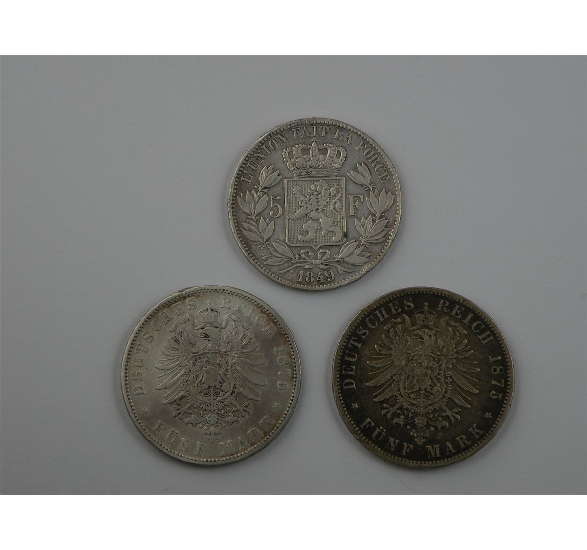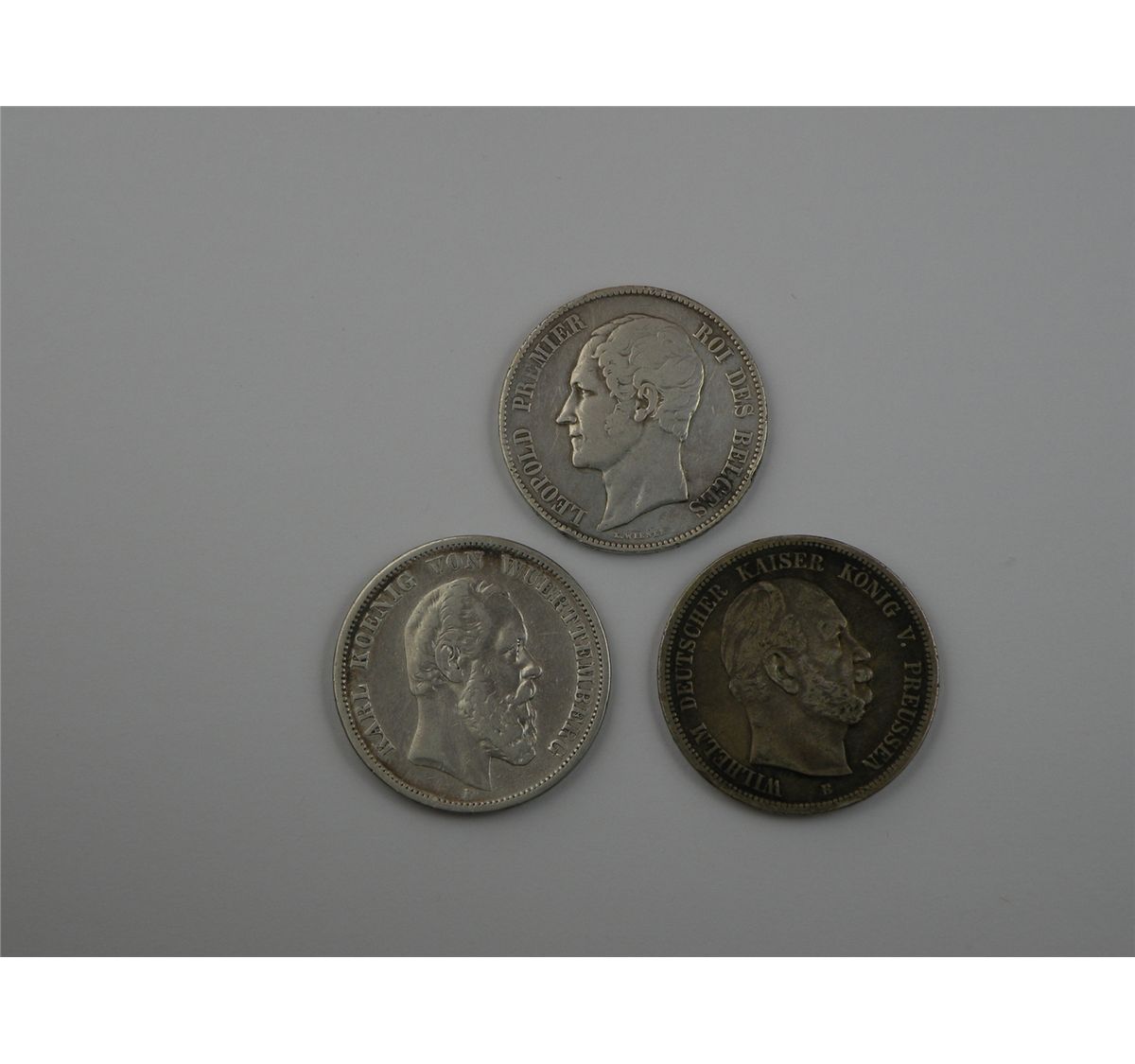 European silver crown trio. Belgium 1849 5 Francs; Prussia 1875 5Mark; Wurttemburg 1875 5 Mark. All are fine or better. The first and last cleaned. Est.$85
