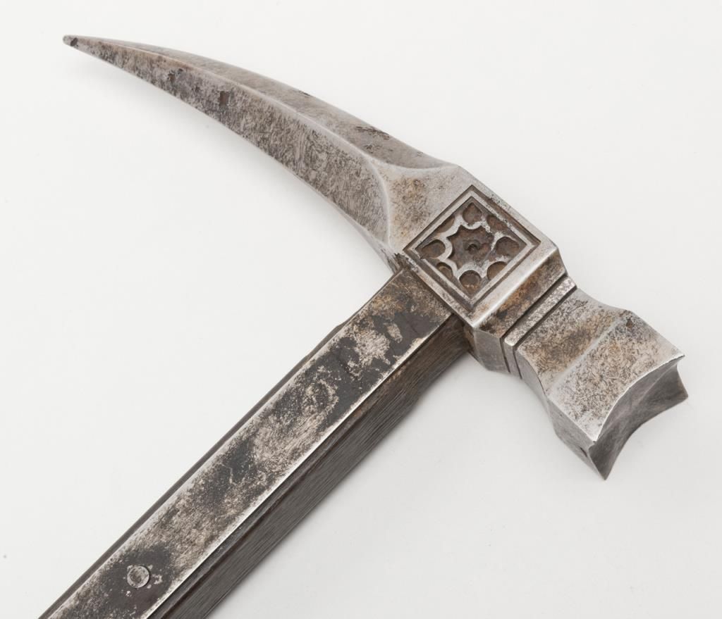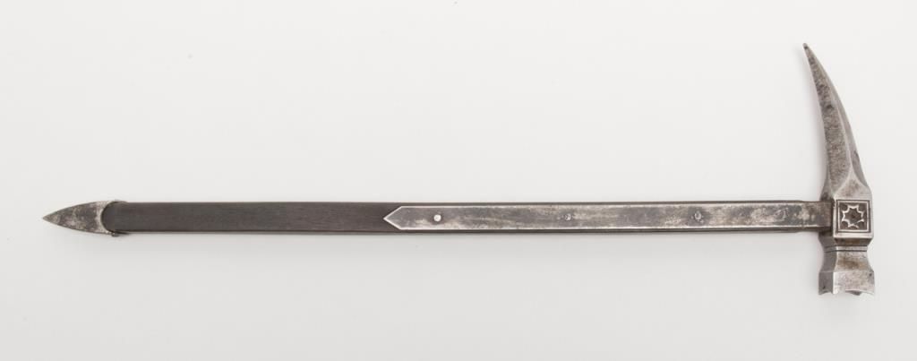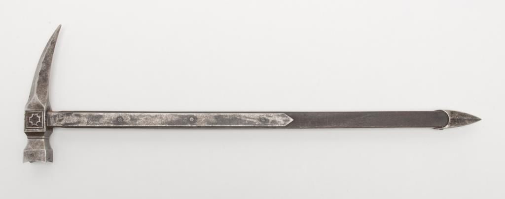 European style battle ax with armor piercing head and hammer back mounted on a wood shaft and Victorian made in 16th-century style. The ax measures 27 ½” overall and the head measures 8 ½” from tip to end. Ancient armor and weapons wererare even in the 19th century and several firms such as Schmidt in Germany re-created classic armorial period weapons. Est.: $300-$600