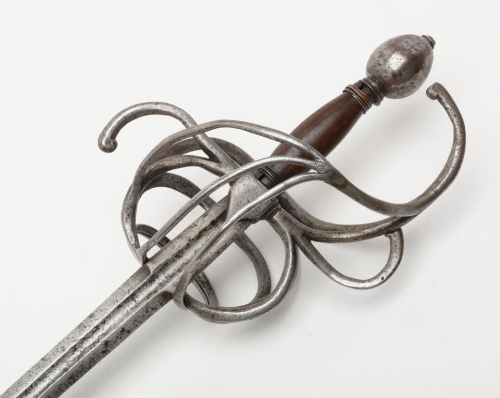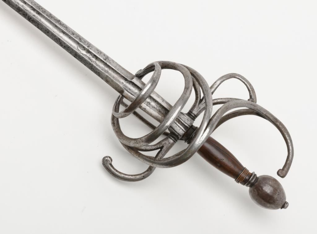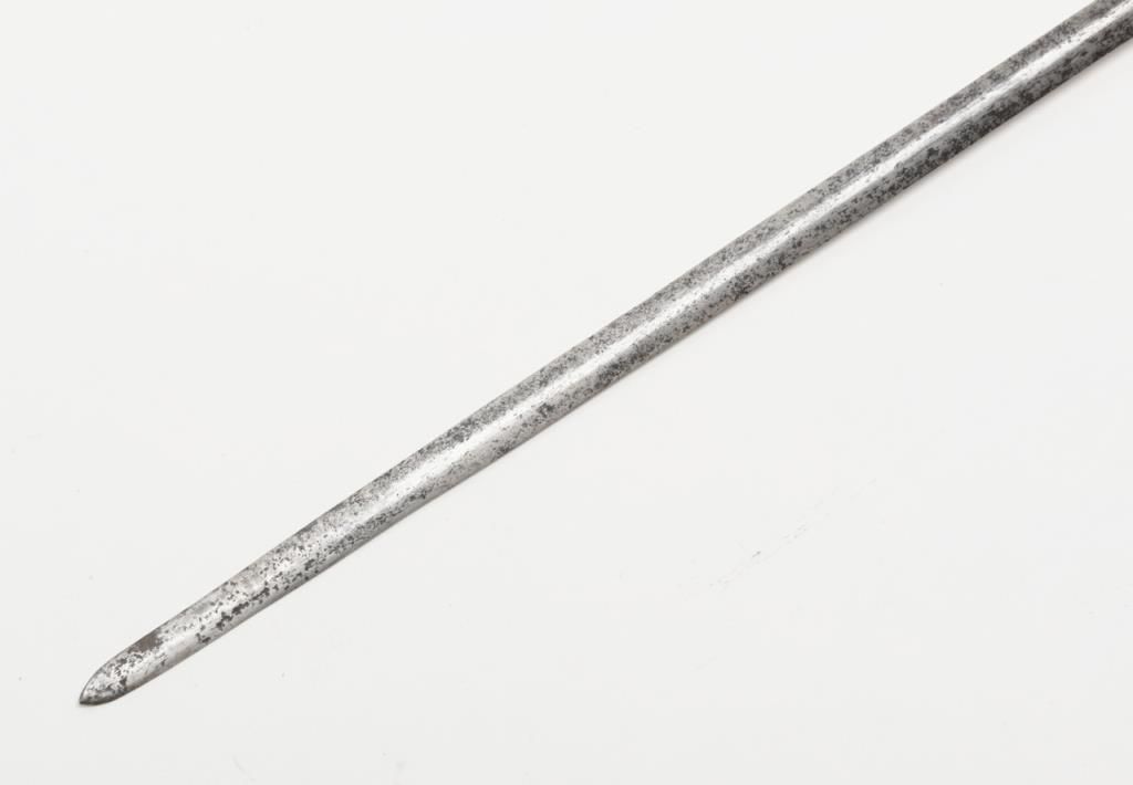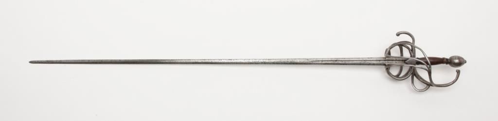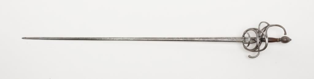 European swept hilt rapier circa late 16th to early 17th century showing 42 ¼” blade and nearly 48” overall. The blade, hilt and pommel are all genuine to the period and well matched. The wood grip is an old replacement wrapped with copperwire and possibly a colonial era repair. The pommel is loose upon the blade. The metal surfaces show some pitting and aging. Rapiers are disappearing and this one would improve with minor restoration. Est.: $2,500-$5,000