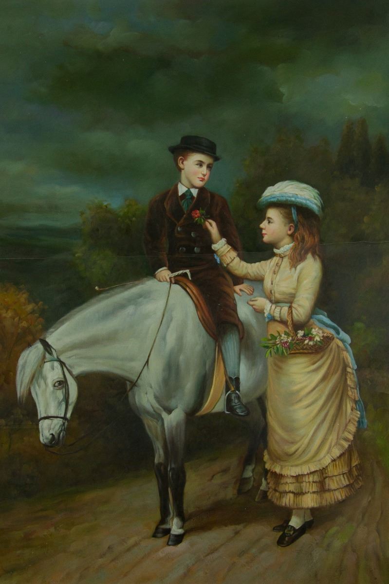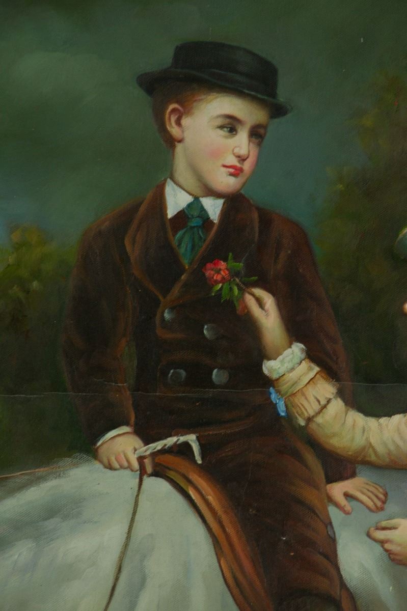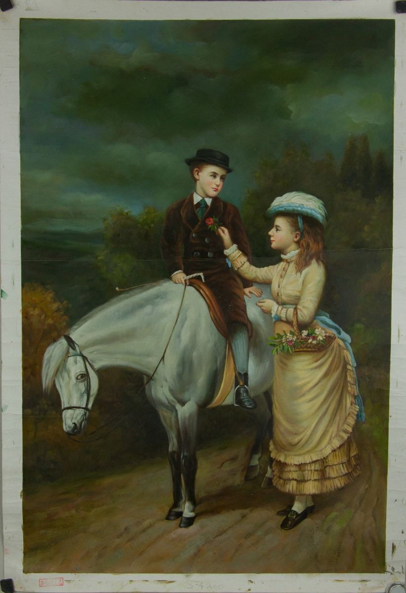 Boy rides on horse with a girl; European oil painting on canvas; 99 cm X 69 cm
