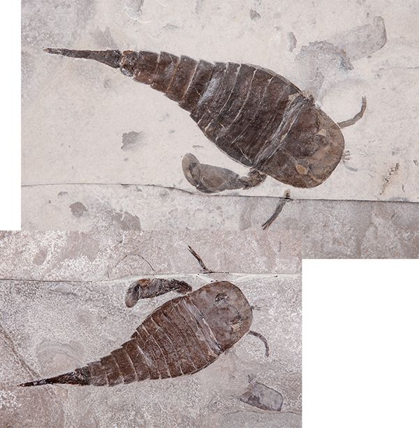 Eurypterids, Sea Scorpions Positive and Negative Slab. Eurypterids, also known as sea scorpions were fierce predators in the warm seas 425 million years ago. They grew to over 6 feet long and easily hunted the slow moving armored fish of that era. Eurypterids were related to scorpions and were probably the first animal to leave the sea and crawl out on dry land. This highly detailed sea scorpion, Eurypteurus lacustris comes from the famous 425 million year old Fiddler's Green Quarry of Herkimer County, New York. This large specimen is 5 inches long having one paddle, a repaired telson (looks like the stinger in a scorpion but was not poisonous) and two of the six walking legs. These delicate walking legs are rarely preserved. What makes this specimen so unusual is that both the positive and negative slabs (7x6 inches) were preserved when the super hard grey rock was split to reveal its fossilized treasure inside. Usually, because the rock is so hard, at least one of the halves breaks into many pieces. There is one repaired break line in both the positive and negative halves but this doesn't affect the body detail on the scorpion. Both halves are included in this lot.