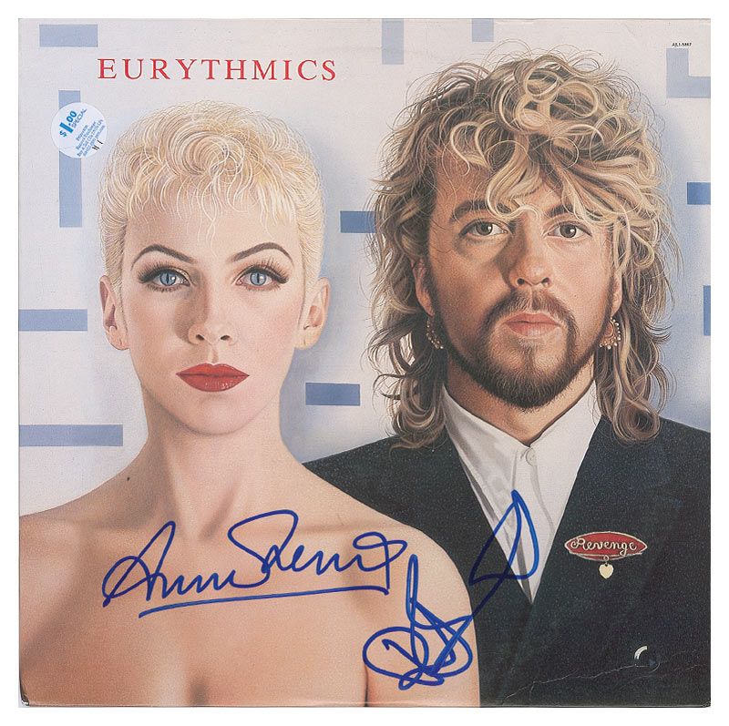 Revenge album signed on the front cover in blue felt tip by Annie Lennox and Dave Stewart. In fine condition, with scattered light creases and a price label affixed to front cover. The record is included.