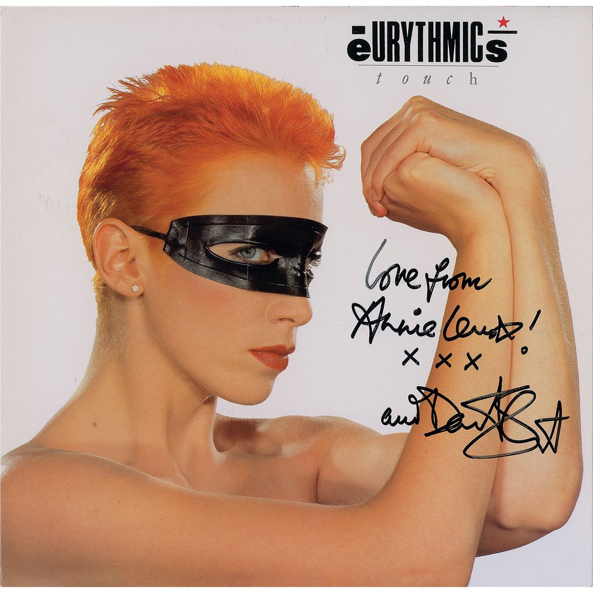 Touch album signed on the front cover in black felt tip, “Love from Annie Lennox! xxx” and “and David A. Stewart.” In fine condition. The record is included. Consignor notes that this originates from the collection of a BBC producer.