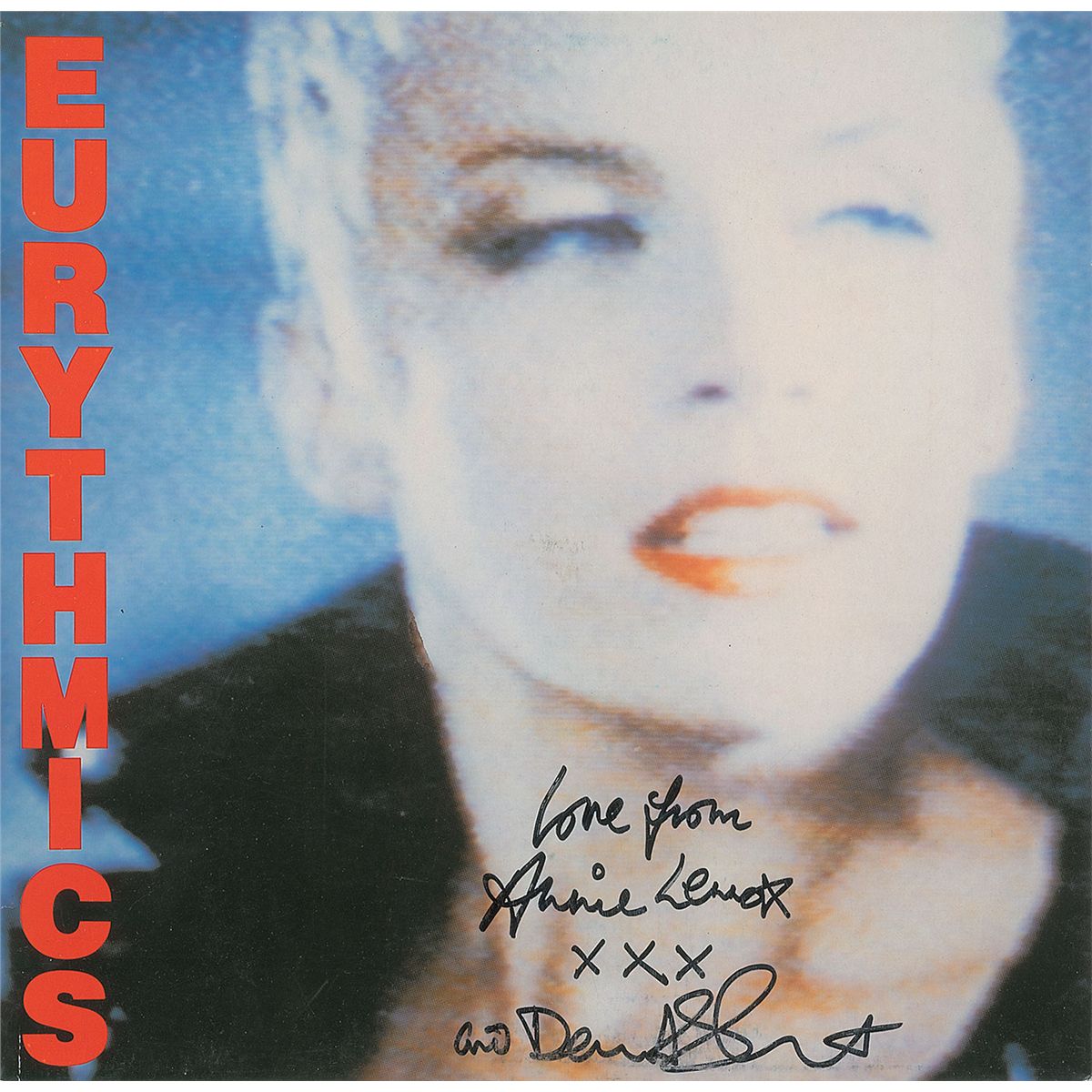 Be Yourself Tonight album, signed on the front cover in black felt tip by both members, “Love from Annie Lennox, xxx,” and “and David A. Stewart.” In fine condition, with light rubbing (affecting Stewart’s signature). The record is included. Consignor notes that the album originates from the collection of a BBC producer.