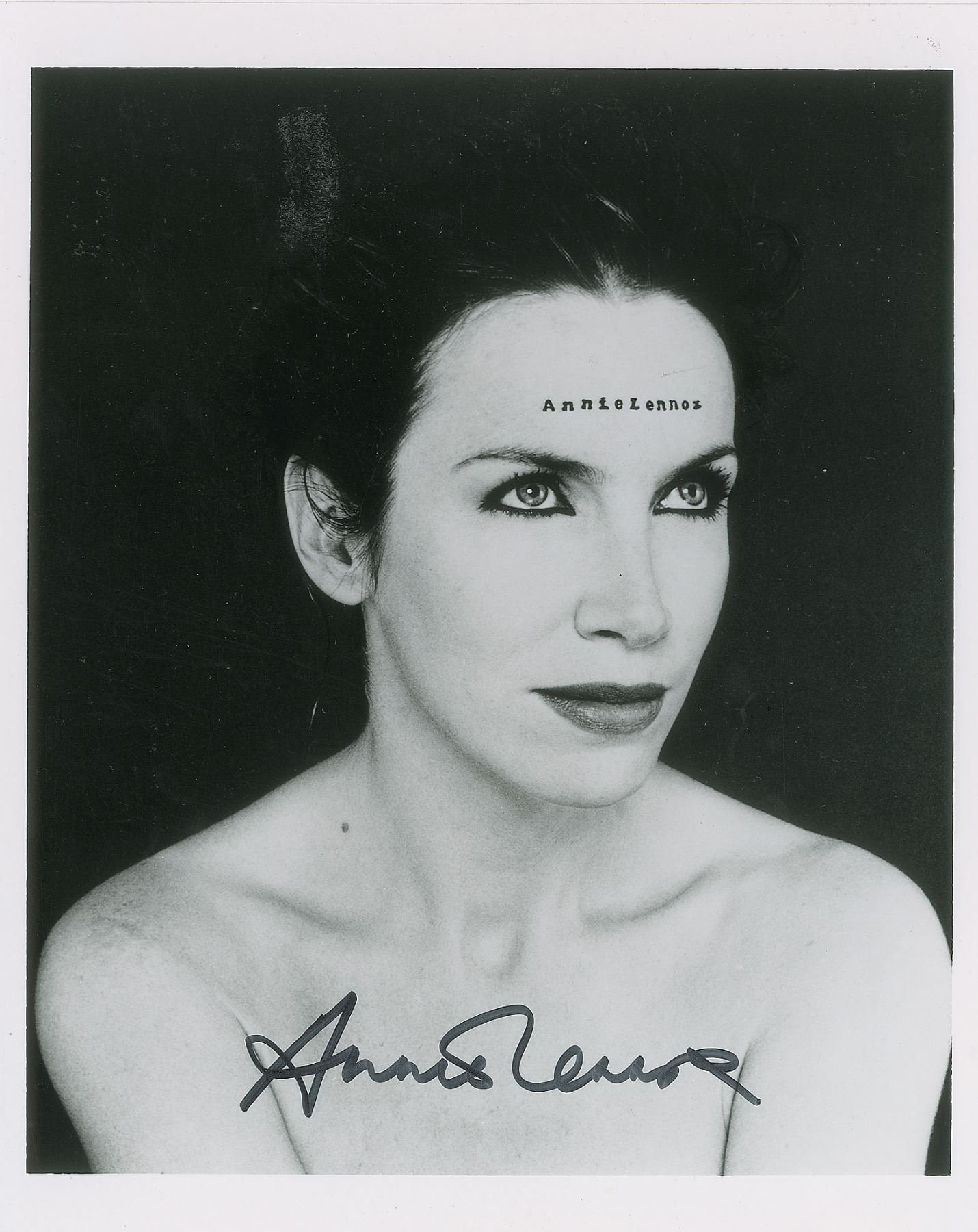 Two photos: a satin-finish 8 x 10 head-and-shoulders photo of Annie Lennox with her name typed on her forehead, signed in black felt tip; and a color glossy 8 x 10.25 photo of Dave Stewart wearing a straw cowboy hat, signed in blue felt tip. In overall fine condition, with scattered light creasing.