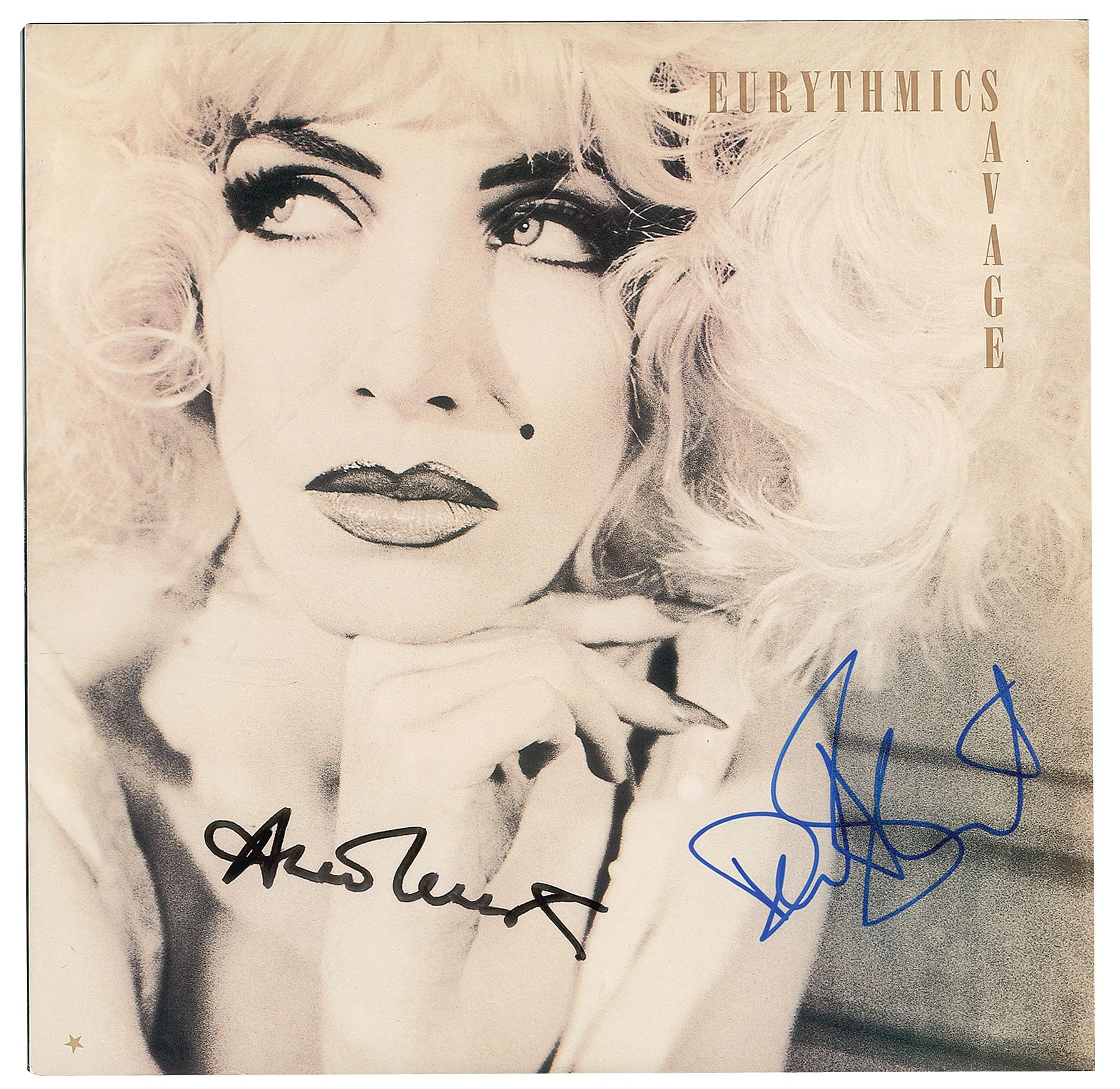 Savage album signed on the front cover in black felt tip by Annie Lennox and in blue felt tip by Dave Stewart. In fine condition. The record is included.