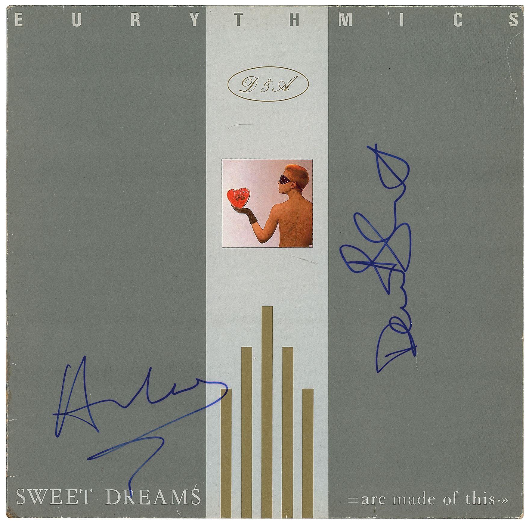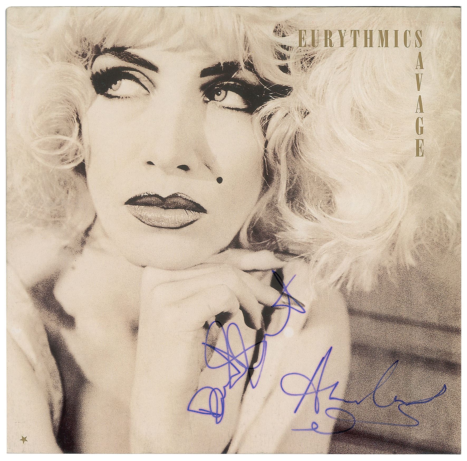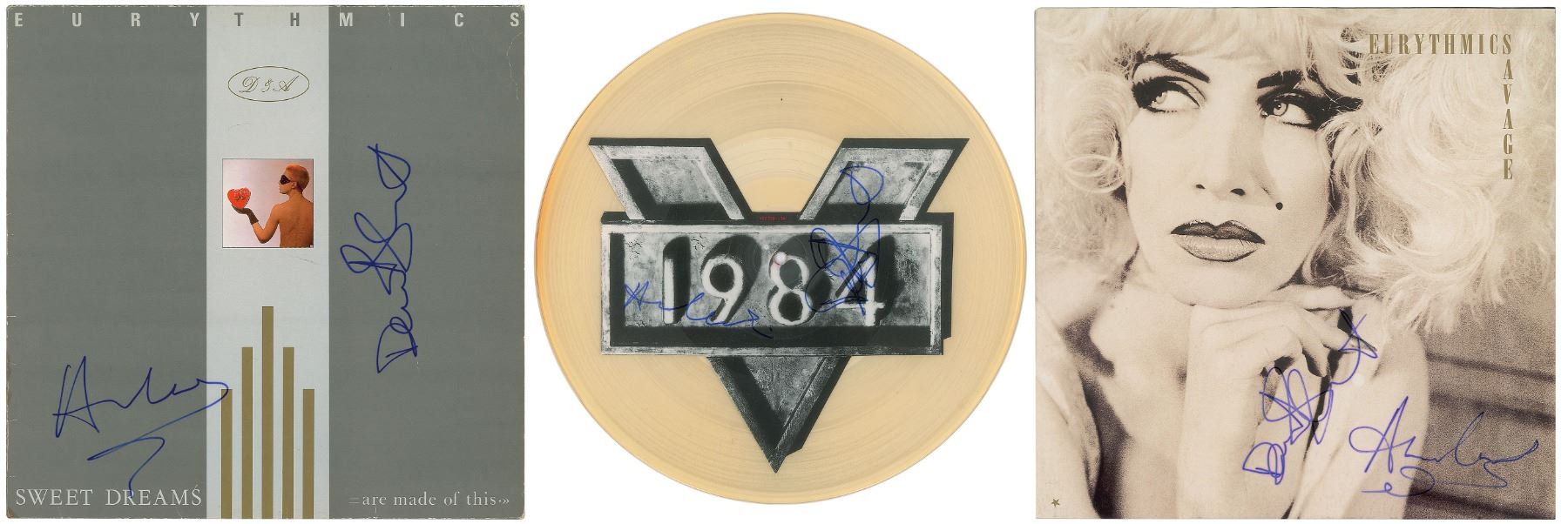 Three albums by the Eurythmics—Savage, Sweet Dreams (Are Made of This), and 'Sexcrime (Nineteen Eighty-Four)' picture disc single—each signed in blue felt tip by Annie Lennox and Dave Stewart. In overall fine condition.