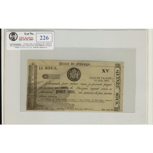 Eustache Brunet dit Letang, Pointe Claire, Lower Canada 15 Sous, 71/2 Pence 25 Aout, 1837. An unsigned remainder. F-VF