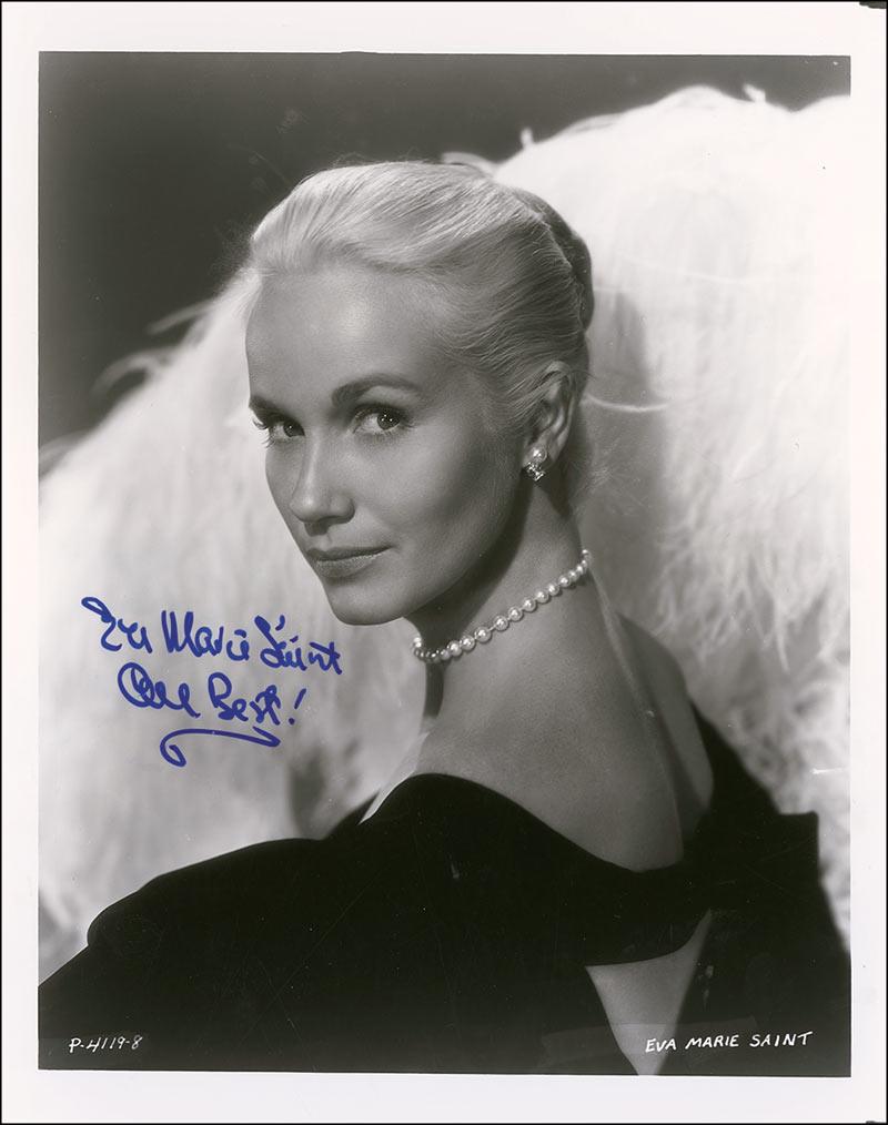 Pretty glossy 8 x 10 photo of the actress looking over her shoulder, signed in blue felt tip, “Eva Marie Saint, All Best!” In very fine condition.