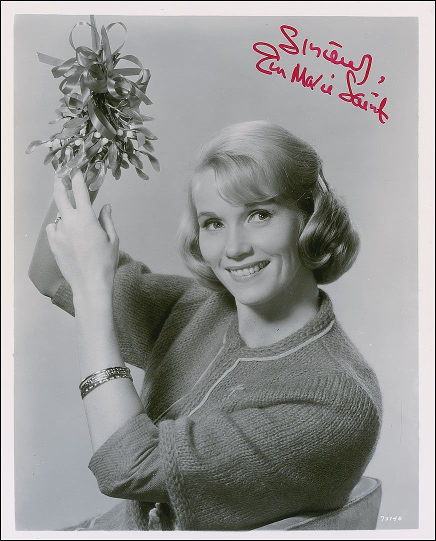 Adorable glossy 8 x 10 photo of Saint holding mistletoe over her head, signed in red felt tip, “Sincerely, Eva Marie Saint.” In fine condition, with a few trivial surface creases and dings.