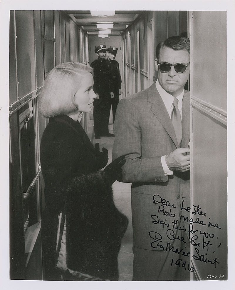 Glossy 8 x 10 photo of Saint with Cary Grant in North by Northwest, signed and inscribed in black felt tip, “Dear Lester, Rob made me sign this for you. All best! Eva Marie Saint, 1996.” In fine condition.