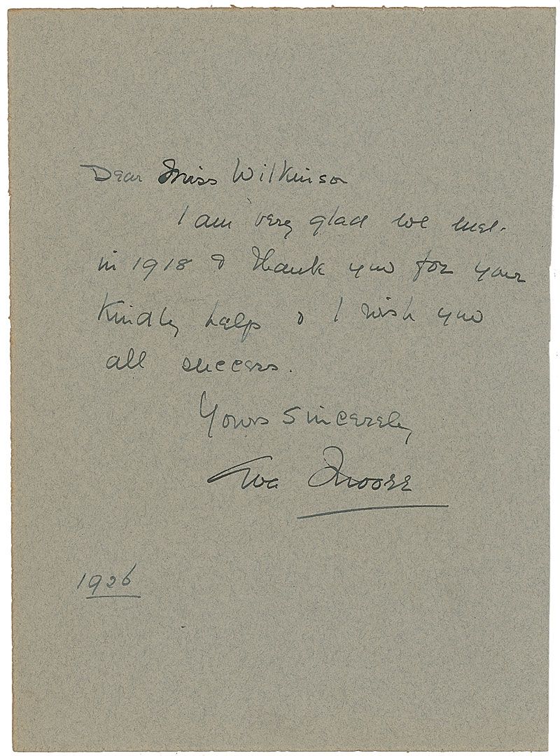 English actress (1870–1955) whose career spanned six decades and included a role alongside Boris Karloff in The Old Dark House. ALS, one page, 8.75 x 12, 1926. Letter to a friend. In full: “I am very glad we met in 1918 & thank you for your kindly help & I wish you all success.” In fine condition, with light toning to borders.