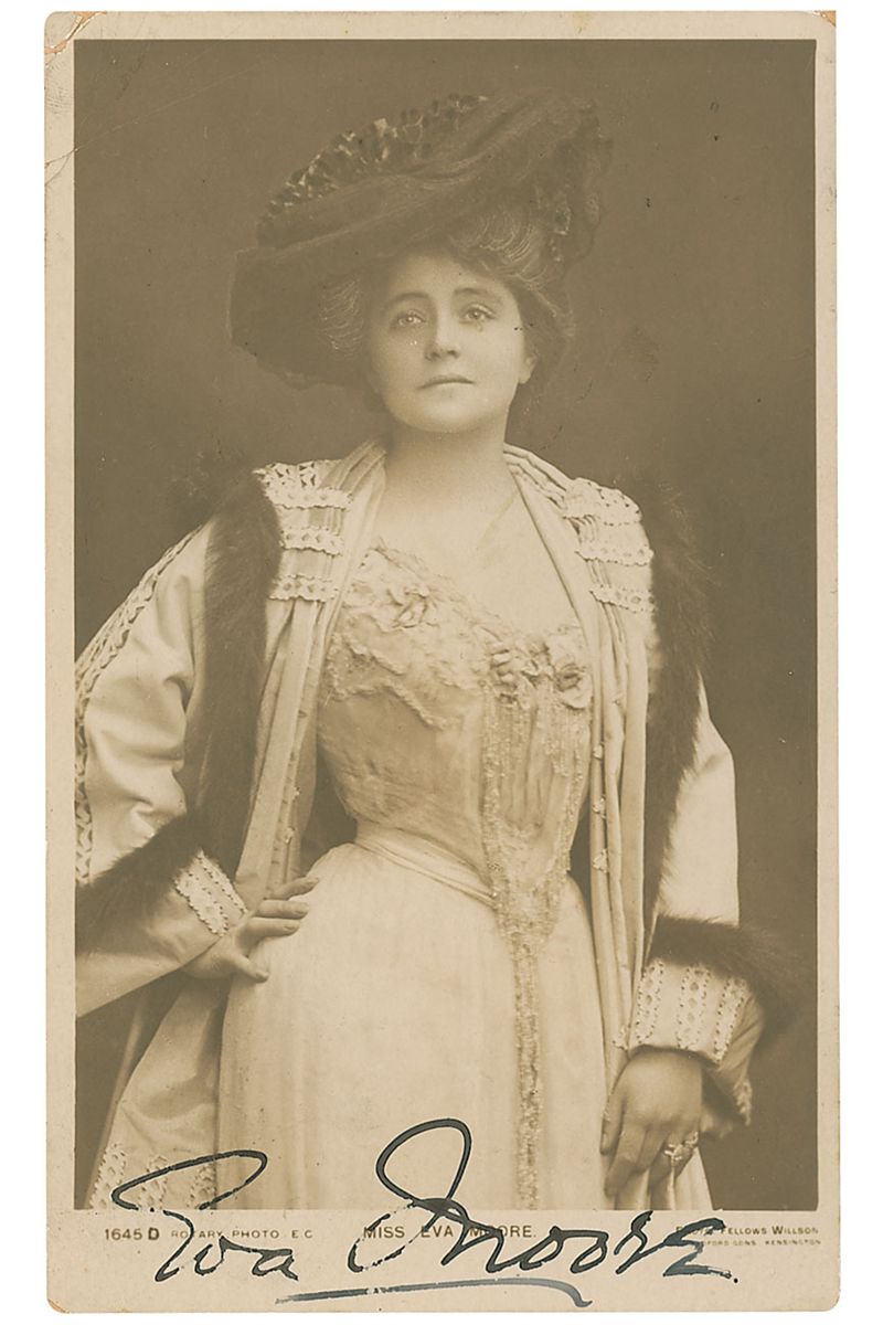 English actress (1870–1955) whose career spanned six decades and included a role alongside Boris Karloff in The Old Dark House. Two different vintage 3.25 x 5.5 postcard photos of Moore, each signed in fountain pen, with Moore adding a brief sentiment to one. A few creases and surface marks to one photo and some light silvering to the other, otherwise fine condition.