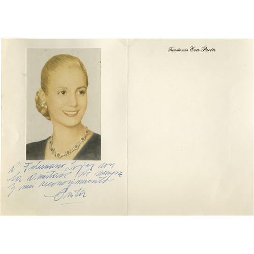 <B>Eva Perón Signature.</B></I> Here we feature a lovely signature on a two-page card, the signature and a printed photograph of Eva Perón are on the inside of the first page; she signs and inscribes the piece in Spanish. Her signature reads, "<I>Evita.</B></I>" The card measures 5.75" x 8.25" and the second page is topped with the "<I>Fundación Eva Perón</B></I>" letterhead. Evita, as she was commonly called, was the second wife of Argentine President Juan Domingo Perón, and first lady of Argentina. Though she never held an official office, her charismatic and light personality enabled her to eventually wield more power and influence than anyone but her husband. Her compassion and concern for the impoverished and destitute were her trademarks and she was eventually given the official title of "Spiritual Leader of the Nation," in 1952. Her early and untimely death was a tragedy, for at the time she died she was arguably the most powerful woman in the world. <r The signature and card are in very fine condition; usual folds are present. <BR><BR><B>Important