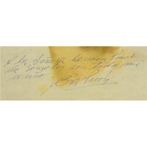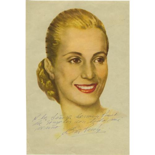 <B>Eva Peron- Large Color Portrait Inscribed and Signed,</B></I> 8.75" x 13". Argentina's most notable first lady smiles broadly here like a Hollywood movie star. Below the idealized image is an inscription to a Mrs. Gonzalez followed by a bold signature. Very fine condition. Eva Peron (1919-1952) raised herself from poverty to become an enduring symbol of feminine spunk in a male-dominated world. As the politically proactive wife of President Juan Person, Eva was one of the most powerful women of her day.<BR><BR><b>Shipping:</b> Flatware (<a target="_blank" href="http://www.heritageauctions.com/common/shipping.php">view shipping information</a>)