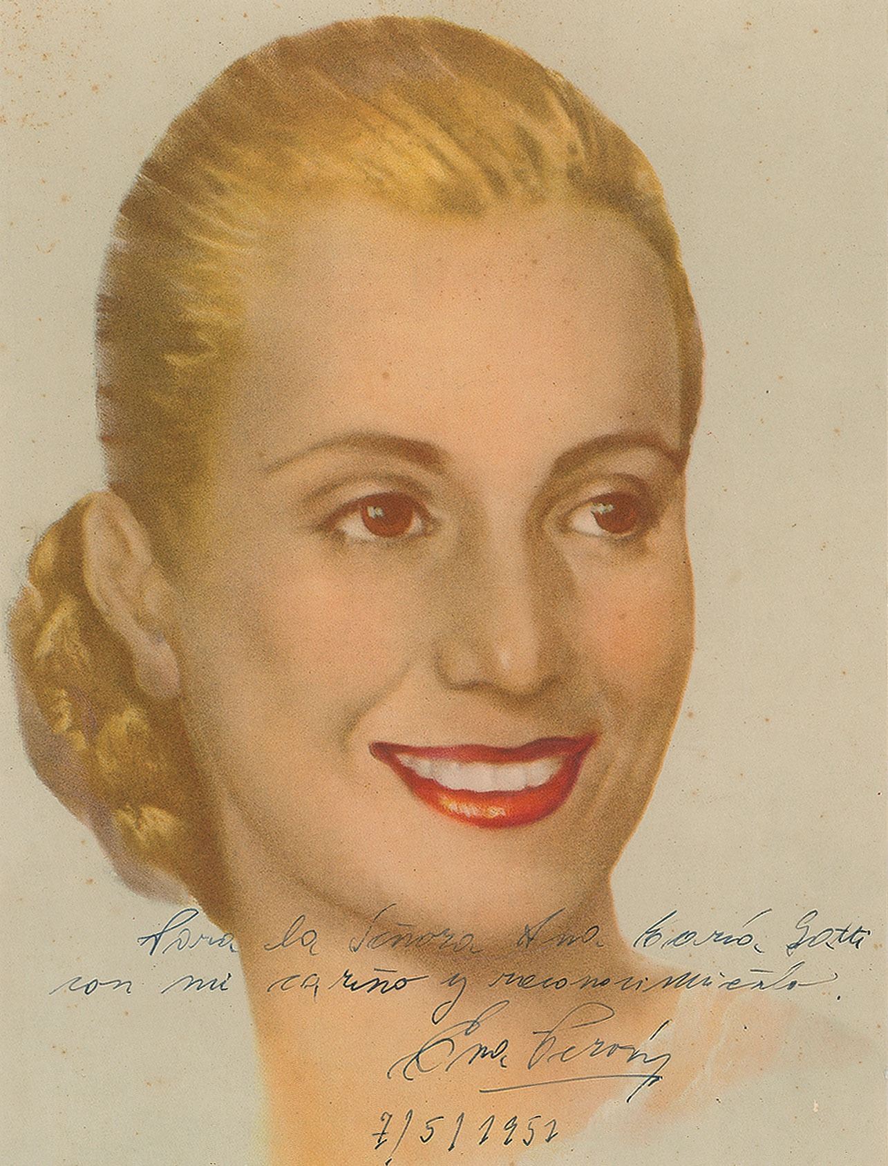 Color vintage 7.75 x 10.5 paperstock close-up photo of the beloved Argentine leader, signed and inscribed in fountain pen, "Para la Senora…con mu corino y reconocimiento, Eva Peron, 7/5/1952.” In very good condition, with overall creasing.