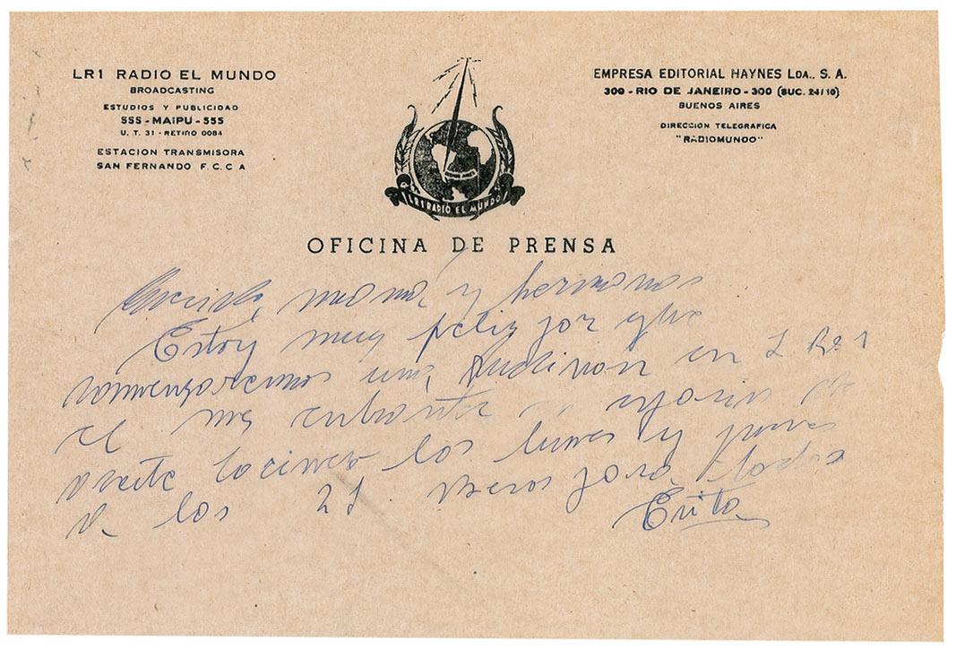 Charismatic and highly ambitious wife of Argentine president Juan Perón (1919–1952) who later became the subject of the popular musical (and subsequent film) Evita. ALS signed “Evita,” one onionskin page, 9.25 x 6.25, LR1 Radio El Mundo Oficina de Prensa letterhead, no date. Letter to her mother and sisters. In full (translated): “I am very happy because we will begin a broadcast on LR1 in the coming month sponsored by Cocinero [Chef] oil Mondays and Thursdays at 9:00. Kisses for all.” Uniform toning, scattered creases and wrinkles, and light mounting remnants to reverse, otherwise fine condition. Peron started her radio career around 1939-40, and in a span of a few short years became one of the highest paid radio actresses in the country.