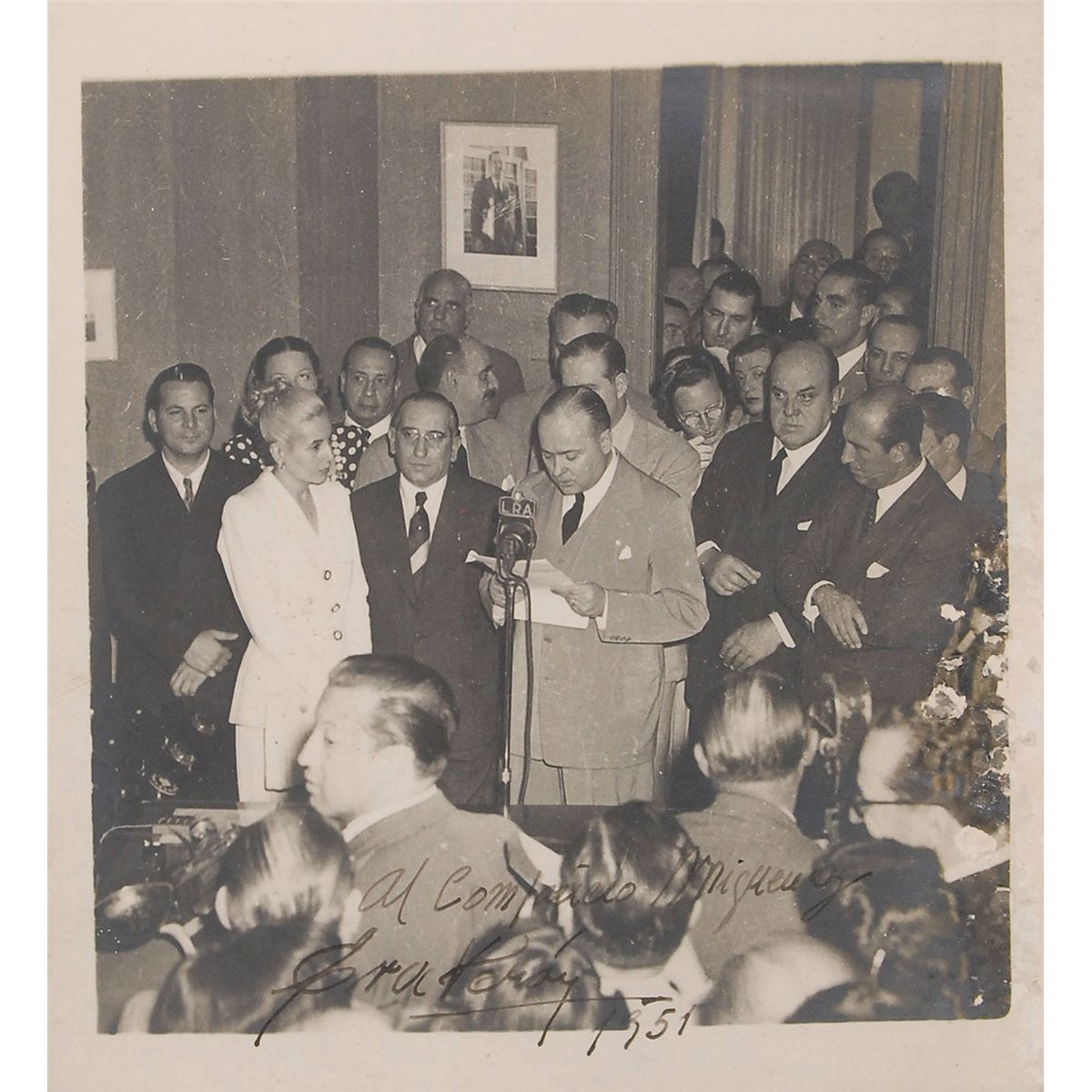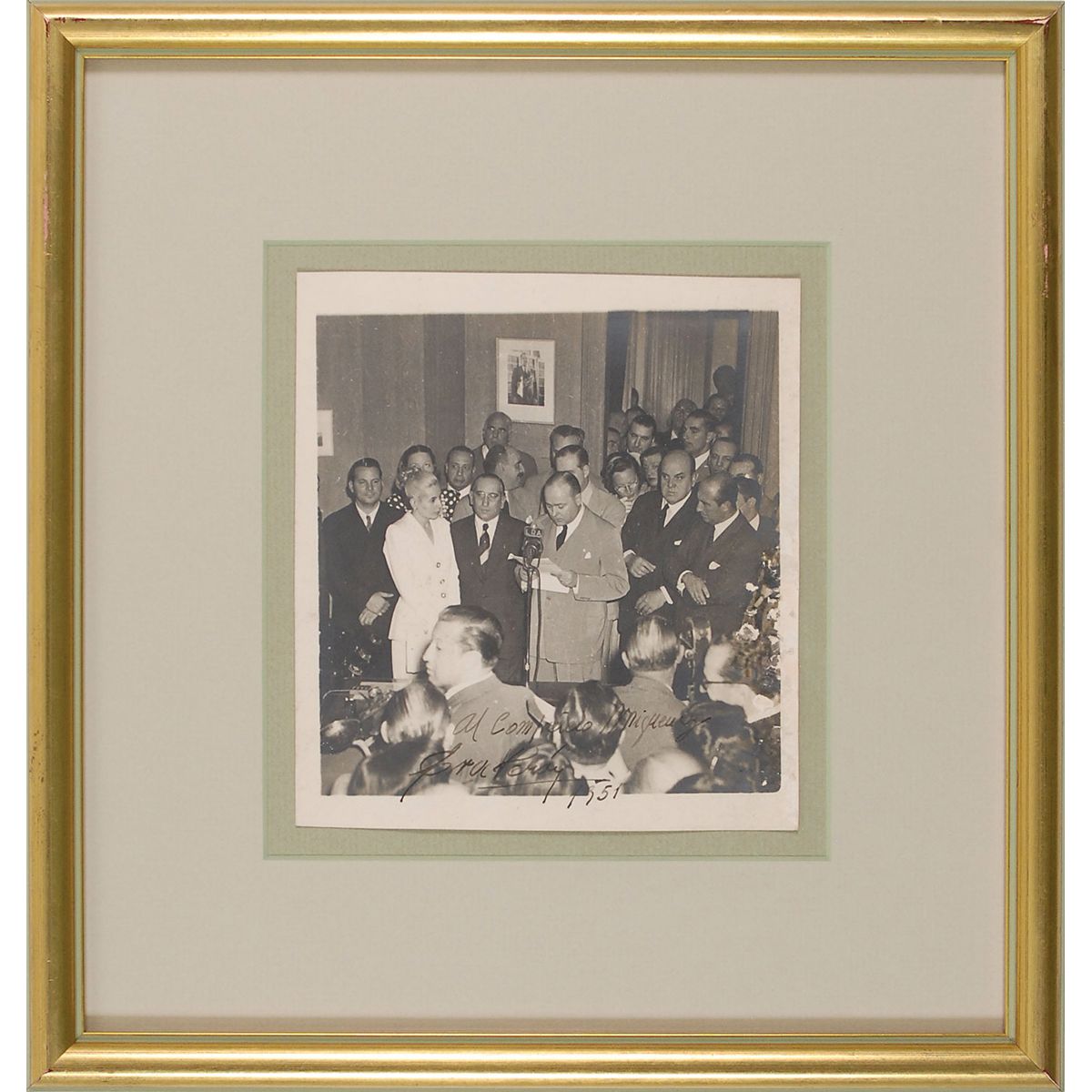 Uncommon matte-finish 6 x 6.5 photo of Peron in a white outfit with her hair tied back, listening to a speech, signed and inscribed in fountain pen, “Al companero Miguenz, Eva Peron, 1951.” Matted and framed to an overall size of 12.25 x 12.75. In very good condition, with surface damage along the right edge.