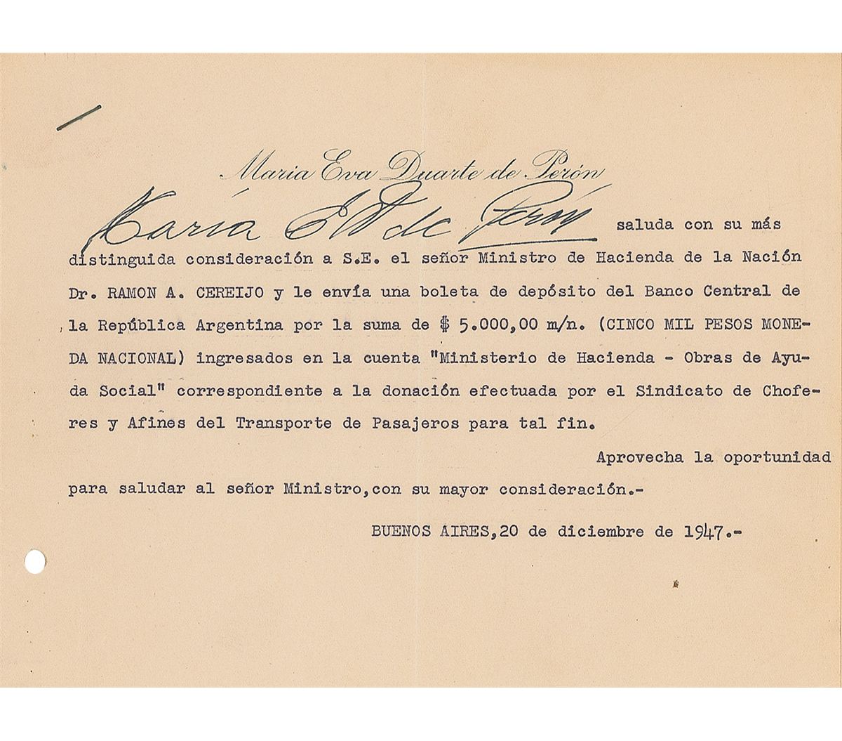 Third-person TLS in Spanish, signed “Maria E. D. de Perón,” one page, 8.5 x 6.75, personal letterhead, December 20, 1947. Solicitation letter addressed to Dr. Ramon Cereijo requesting a donation, with Peron signing her name to the beginning of the letter. In fine condition, with a central vertical fold through a single letter of signature, and a staple and punch hole to left edge.