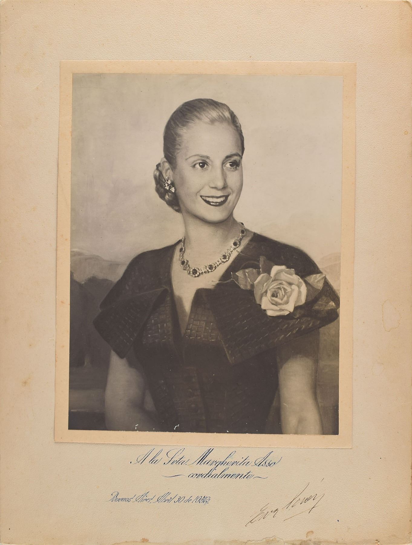 Attractive matte-finish 8.25 x 10.75 photo of a painting of Peron with a large flower on her lapel, affixed to a 12.5 x 16.5 mount, calligraphically inscribed on the mount in blue ink, "A la Srta. Margherita Asso, cordialmente, Buenos Aires, Abril 30 de 1952," and signed below in fountain pen, "Eva Peron.” In very good to fine condition, with some creasing, light staining, and toning to the mount.