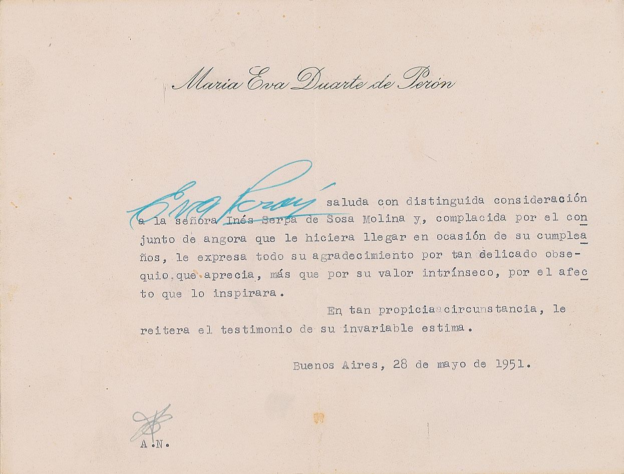 TLS in Spanish, one page, 8.5 x 6.5, personal letterhead, May 28, 1951. Peron thanks Mrs. Ines Serpa de Sosa Molina for birthday wishes, expressing gratitude for "the set of angora that arrived on the occasion of her birthday." In fine condition, with a small stain on the central vertical fold.