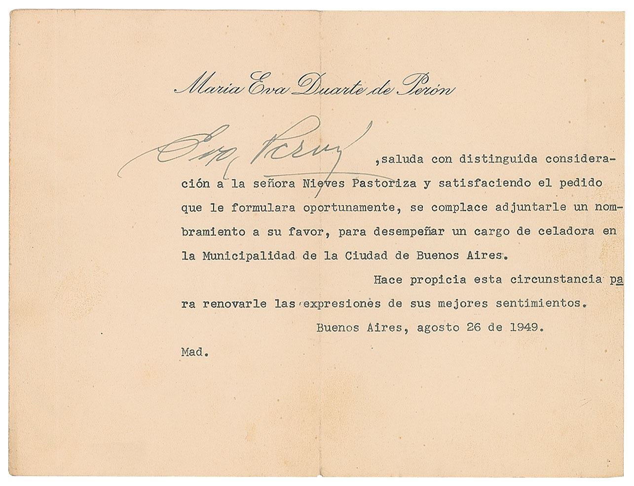 TLS in Spanish, one page, 8.5 x 6.5, personal letterhead, August 26, 1949. Peron responds to a request from Mrs. Nieves Pastoriza by appointing her to serve as a warden in the city of Buenos Aires. In very good to fine condition, with scattered light creasing and three vertical folds.